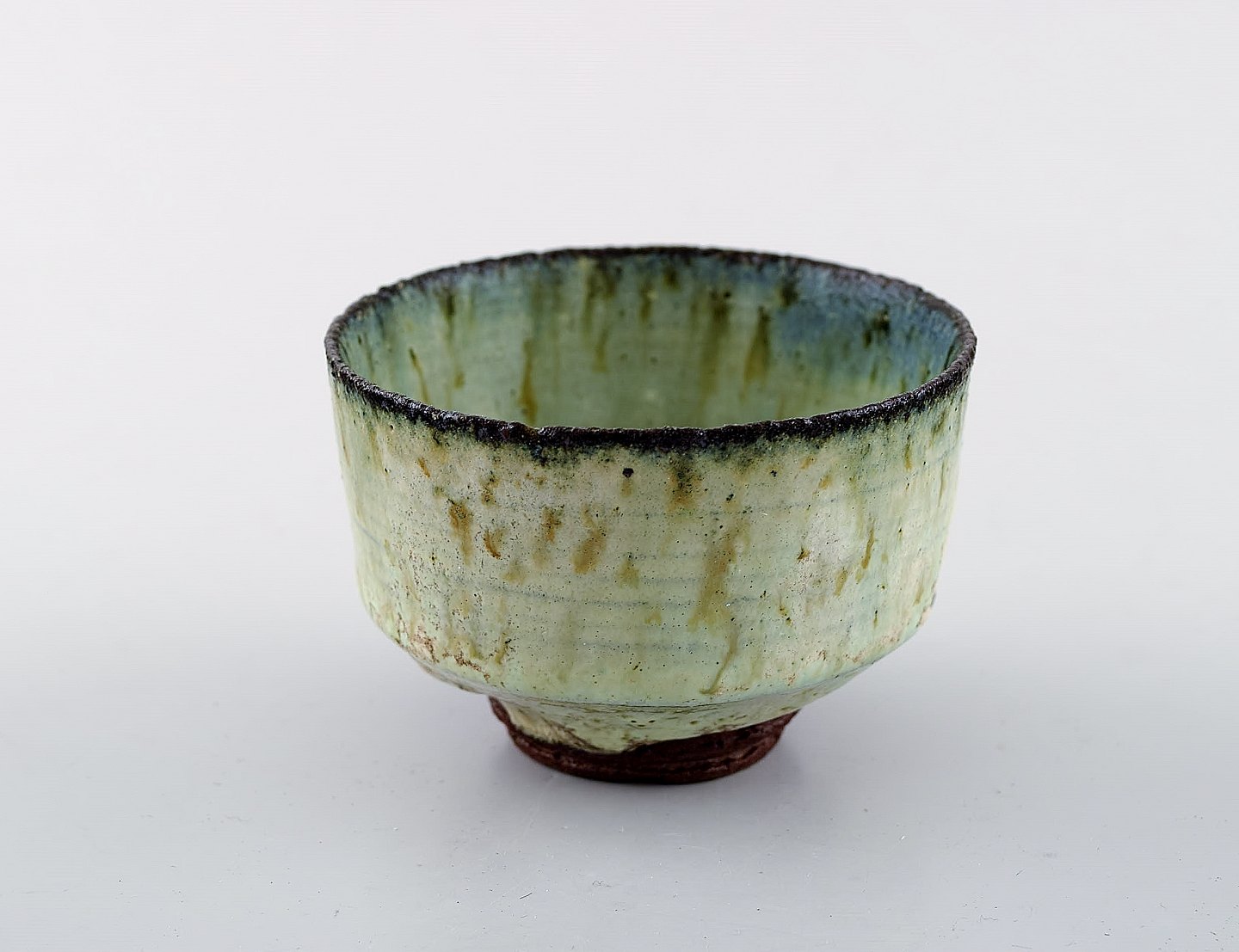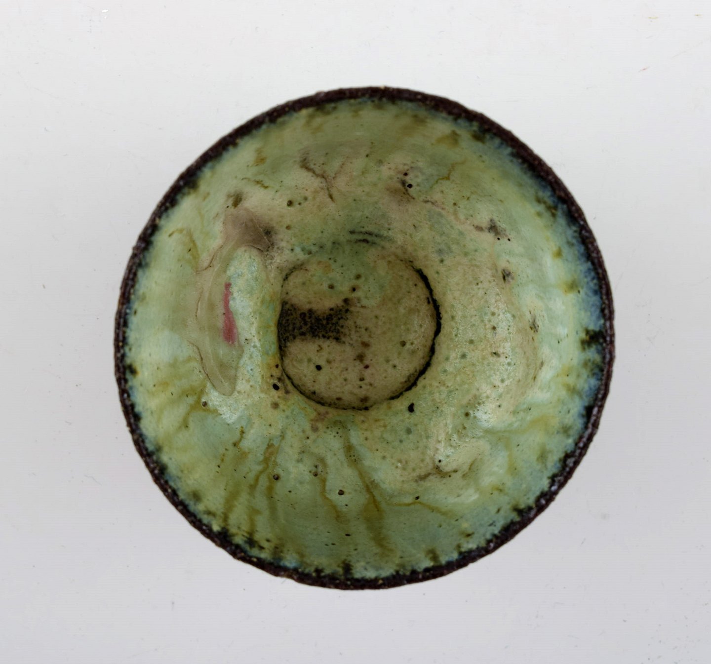 Gutte Eriksen, eget værksted. Skål i glaseret stenøj. Raku brændt teknik. 1950´erne. Måler 7,5 x 5,5 cm. I flot stand.