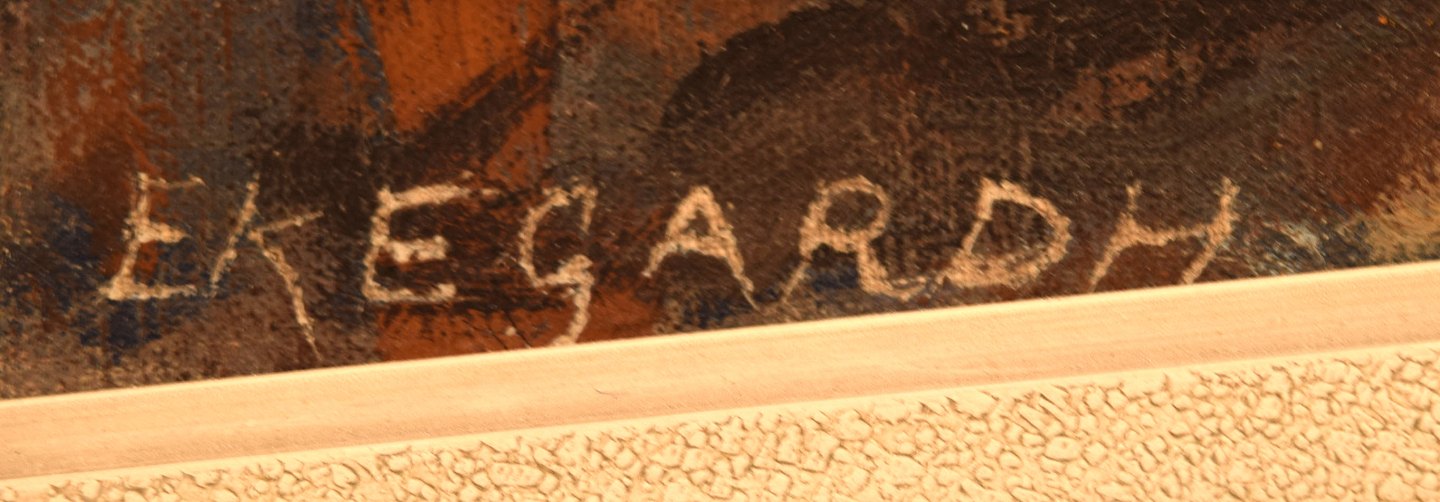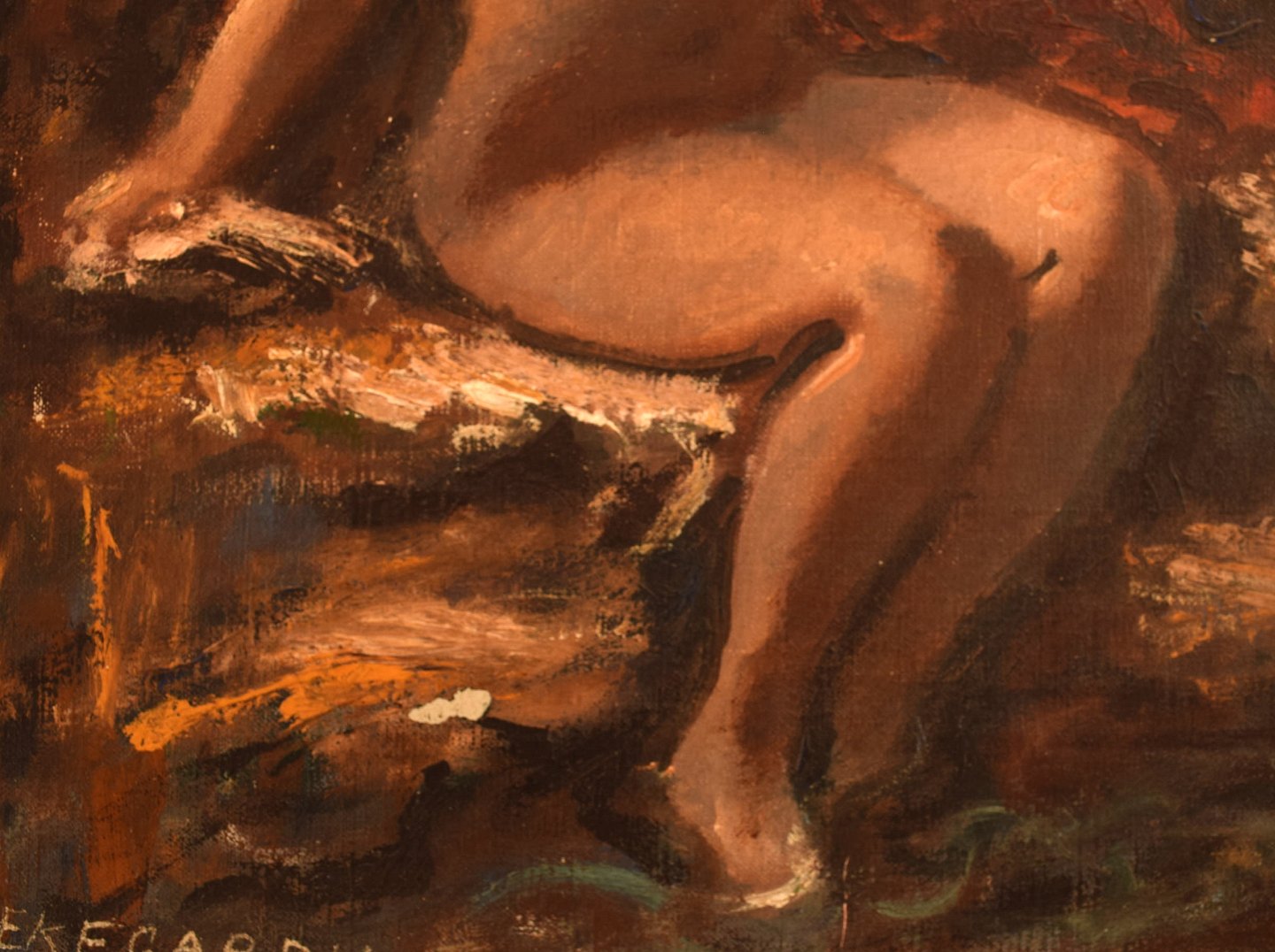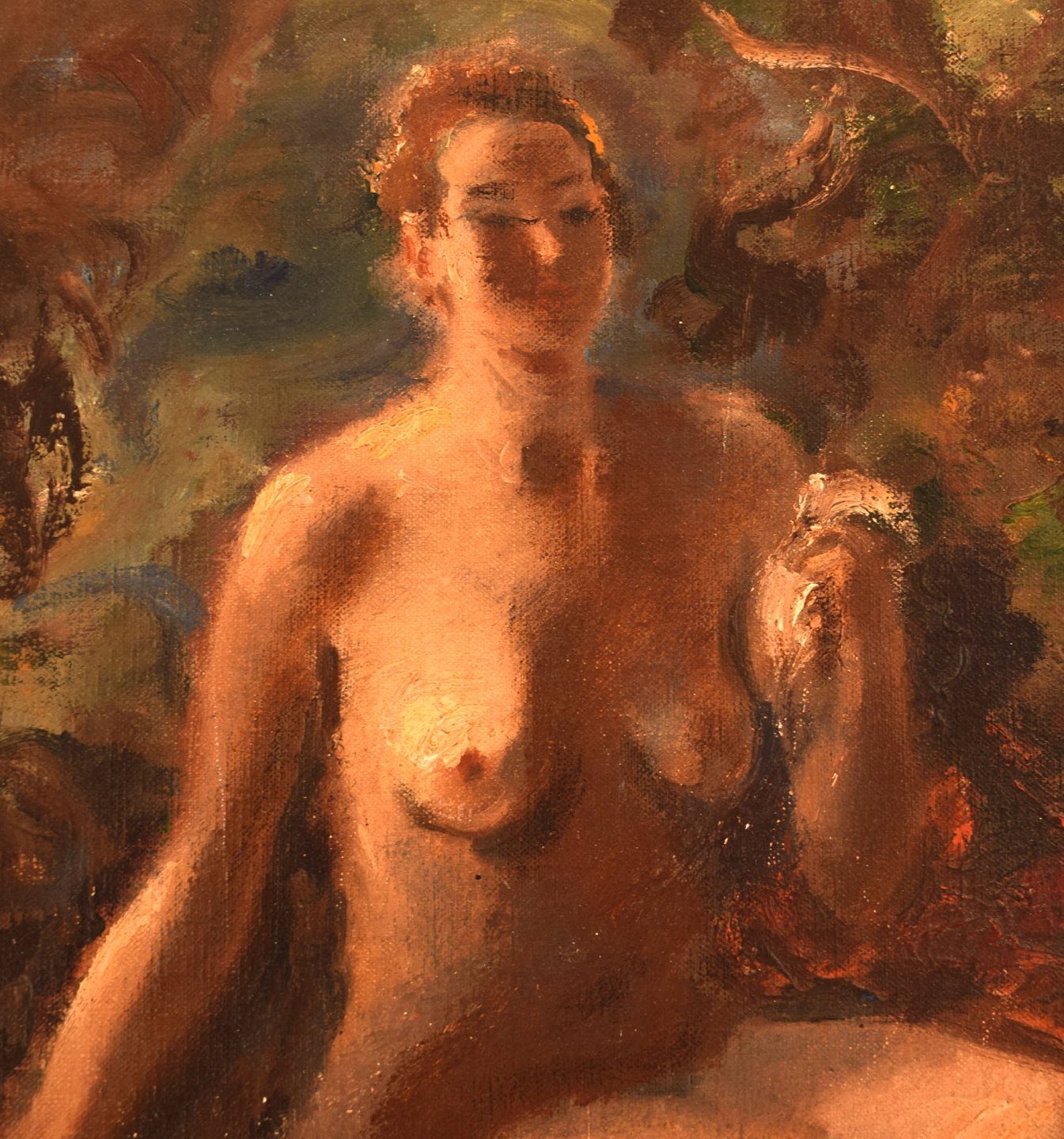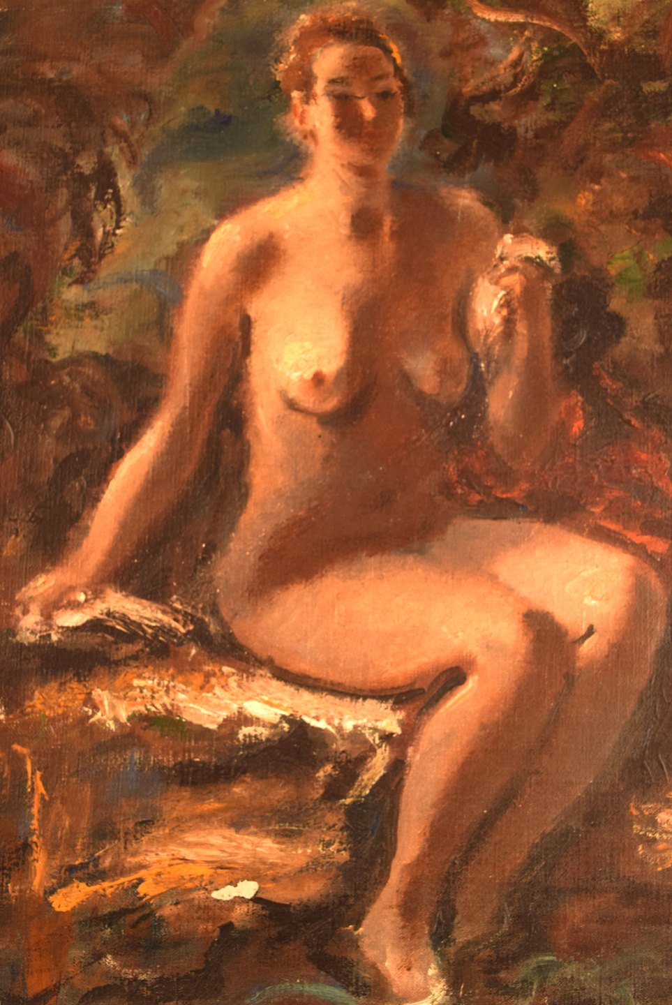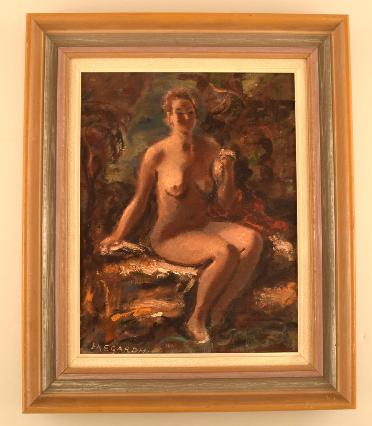 Hans Ekegardh (b. 1881, d.1962), Swedish artist. Oil on canvas. Seated nude model, landscape in the background. 1940's.