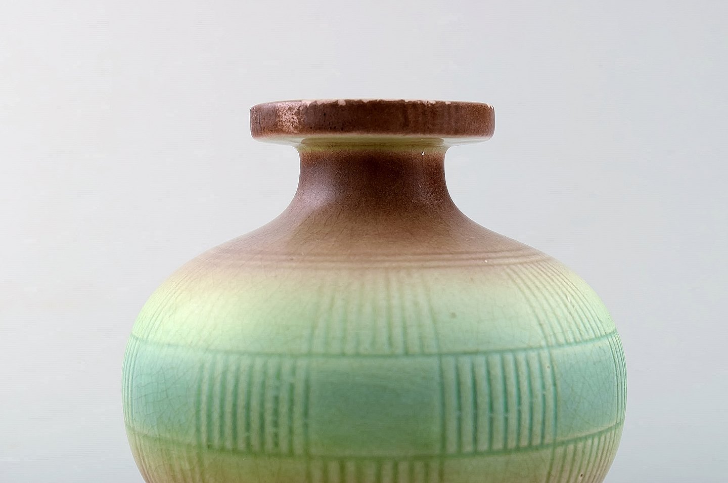 Rörstrand. Rund art deco vase i stentøj. Geometrisk mønster og smuk glasur i lysegrønne og brune nuancer. 1920-1938.