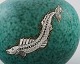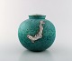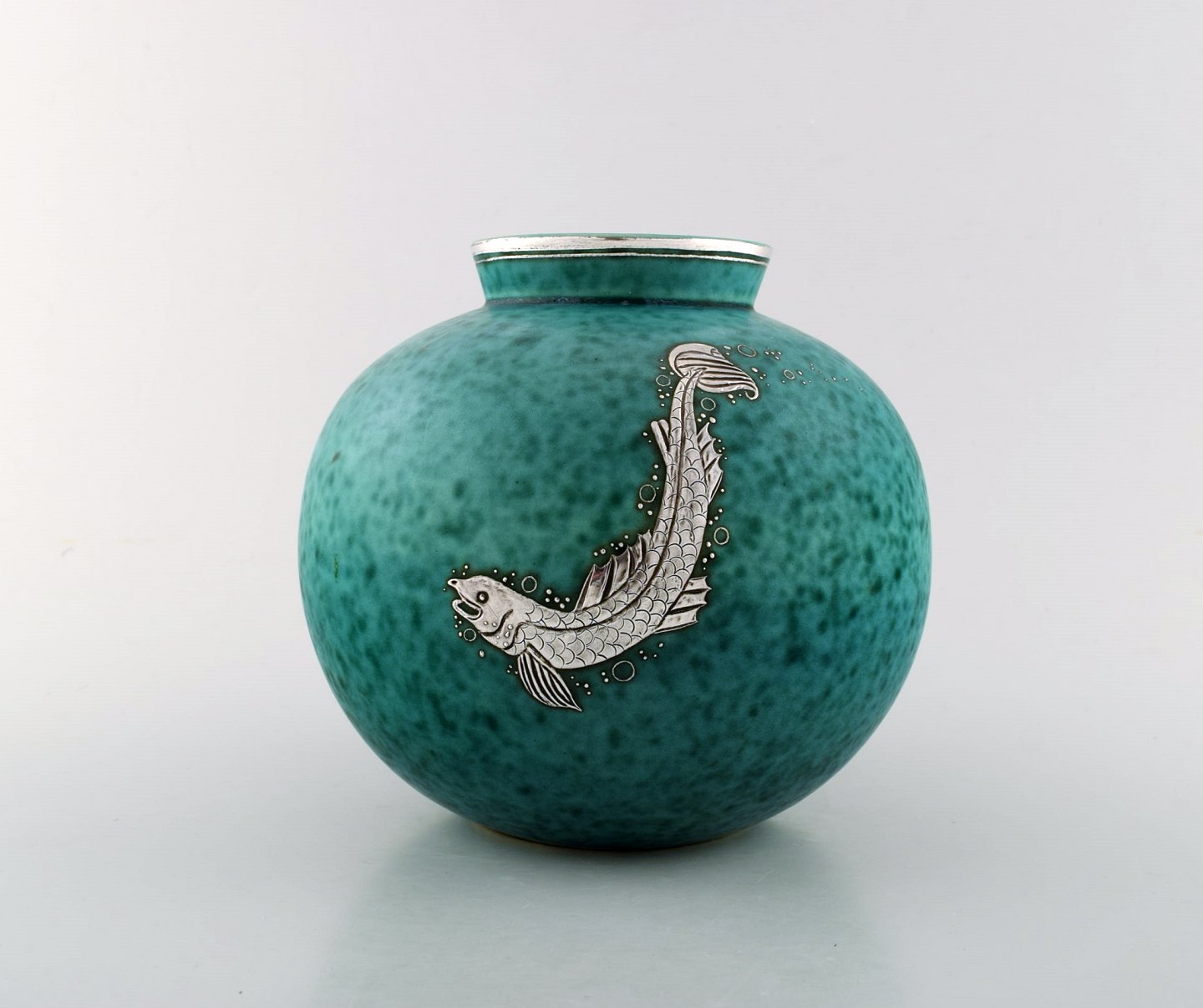 Wilhelm Kåge, Gustavsberg, kuglerund hånddrejet art deco vase i keramik dekoreret med fisk i sølvindlæg.