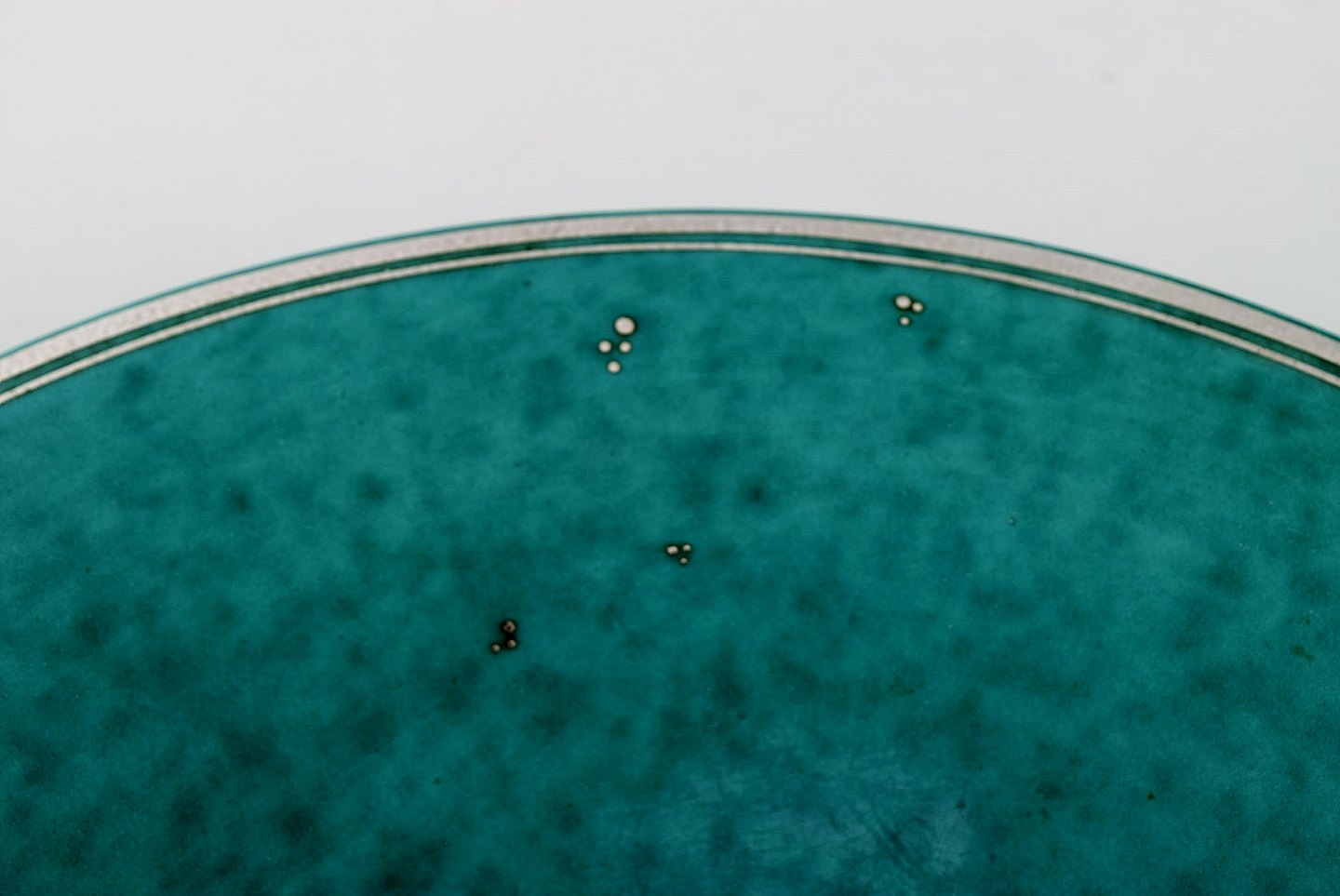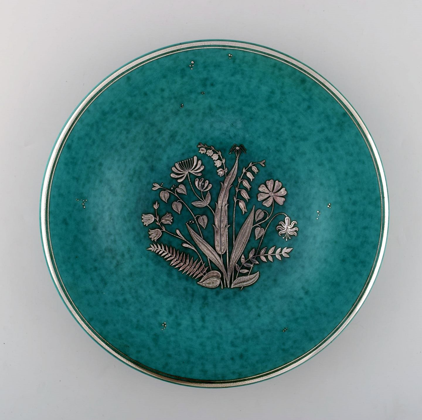 Wilhelm Kåge for Gustavsberg. Large Argenta dish in ceramics decorated with flowers in silver inlaid. Sweden 1940's. Measures 30 x 5 cm. Stamped: Gustavsberg, Kåge. In perfect condition.