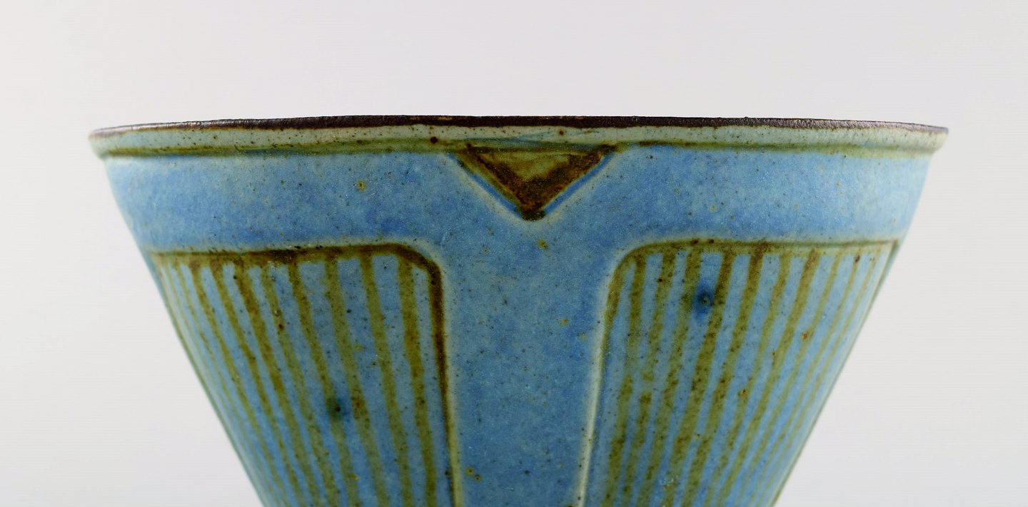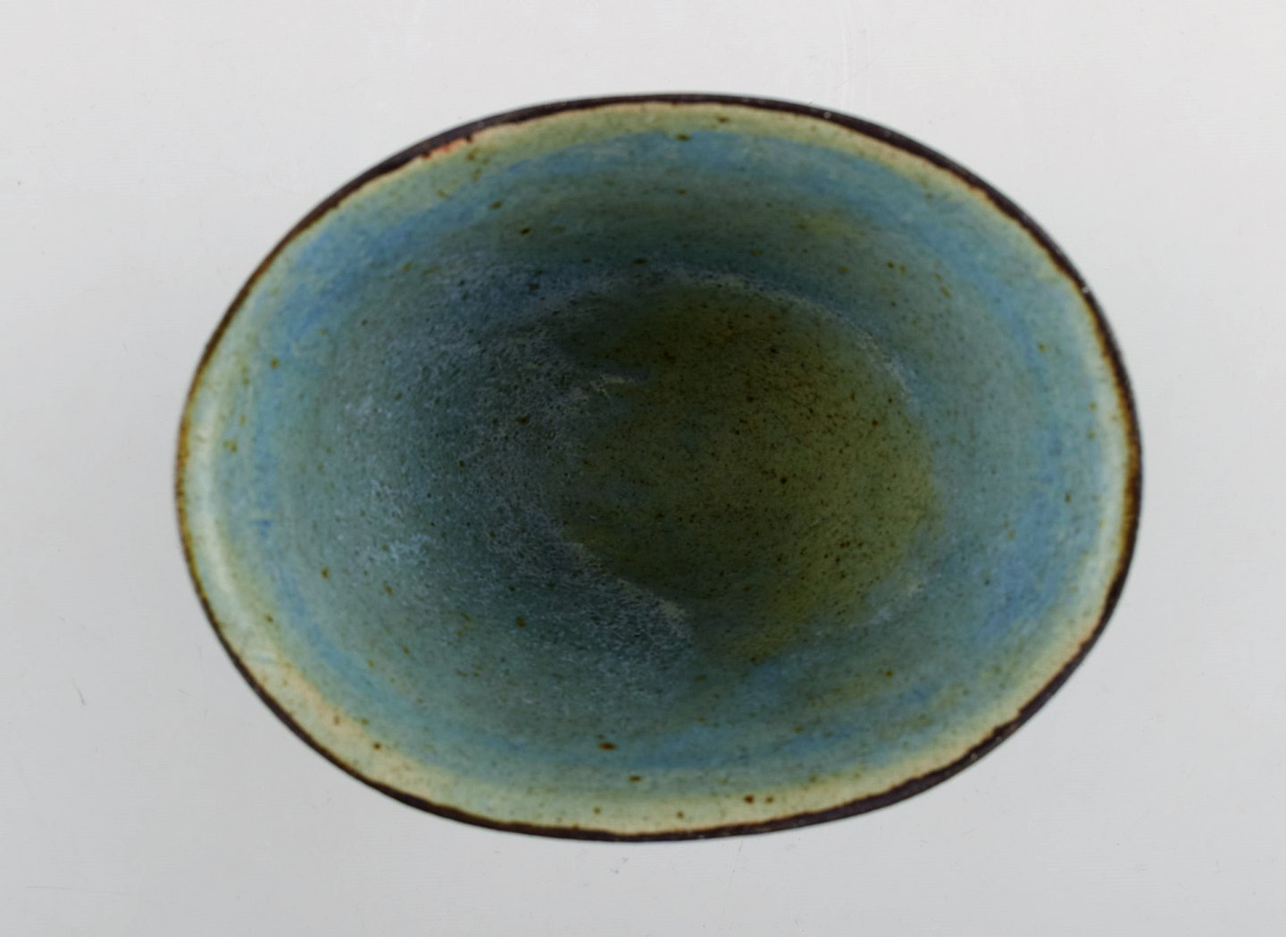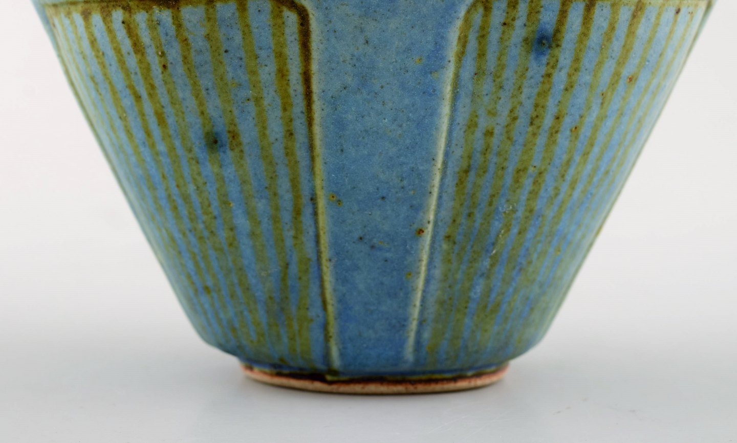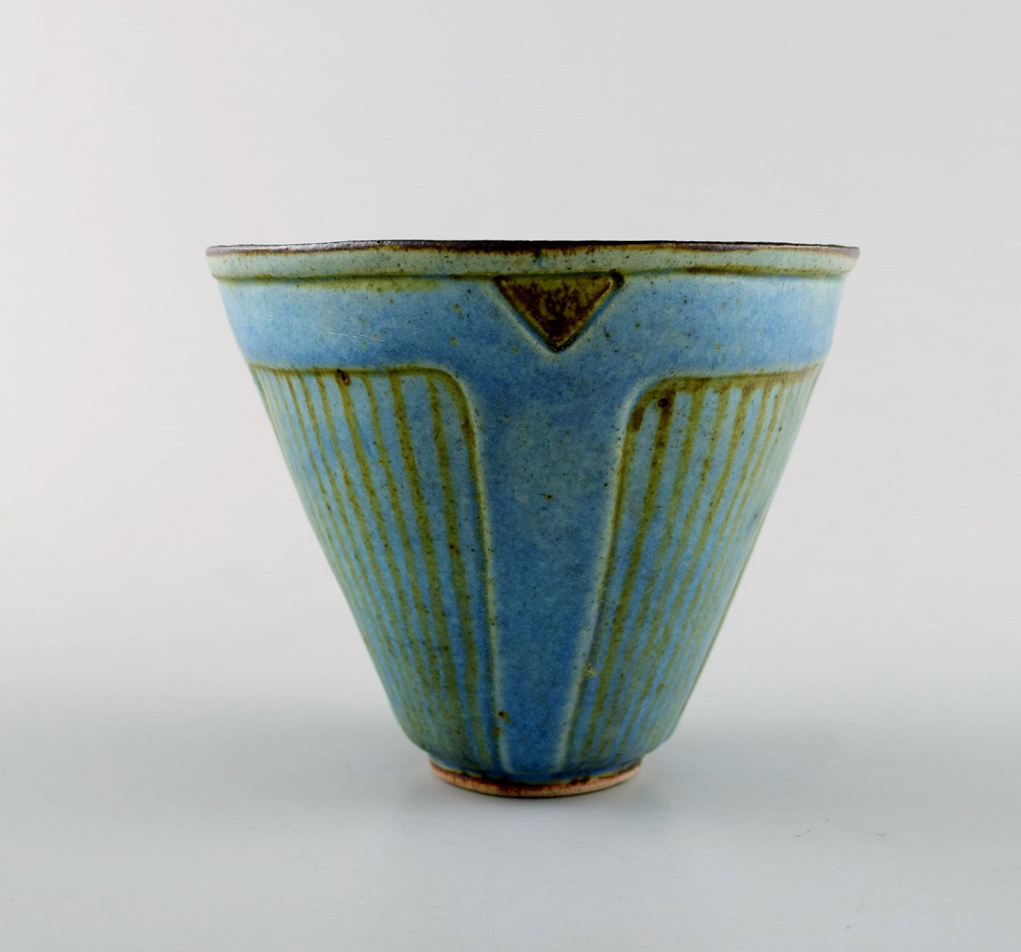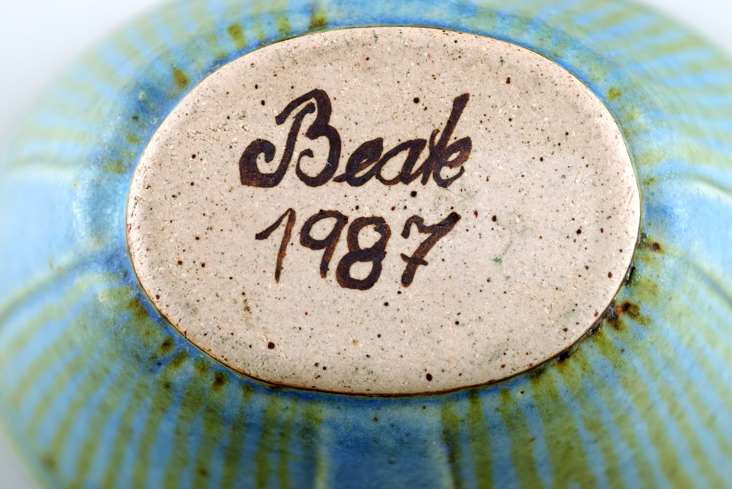 Beate Andersen, dansk keramiker. Unika vase i glaseret keramik. Dateret 1987. Smuk glasur i blå og grønne nuancer. I flot stand. Stemplet. Måler: 15,5 x 10 cm.