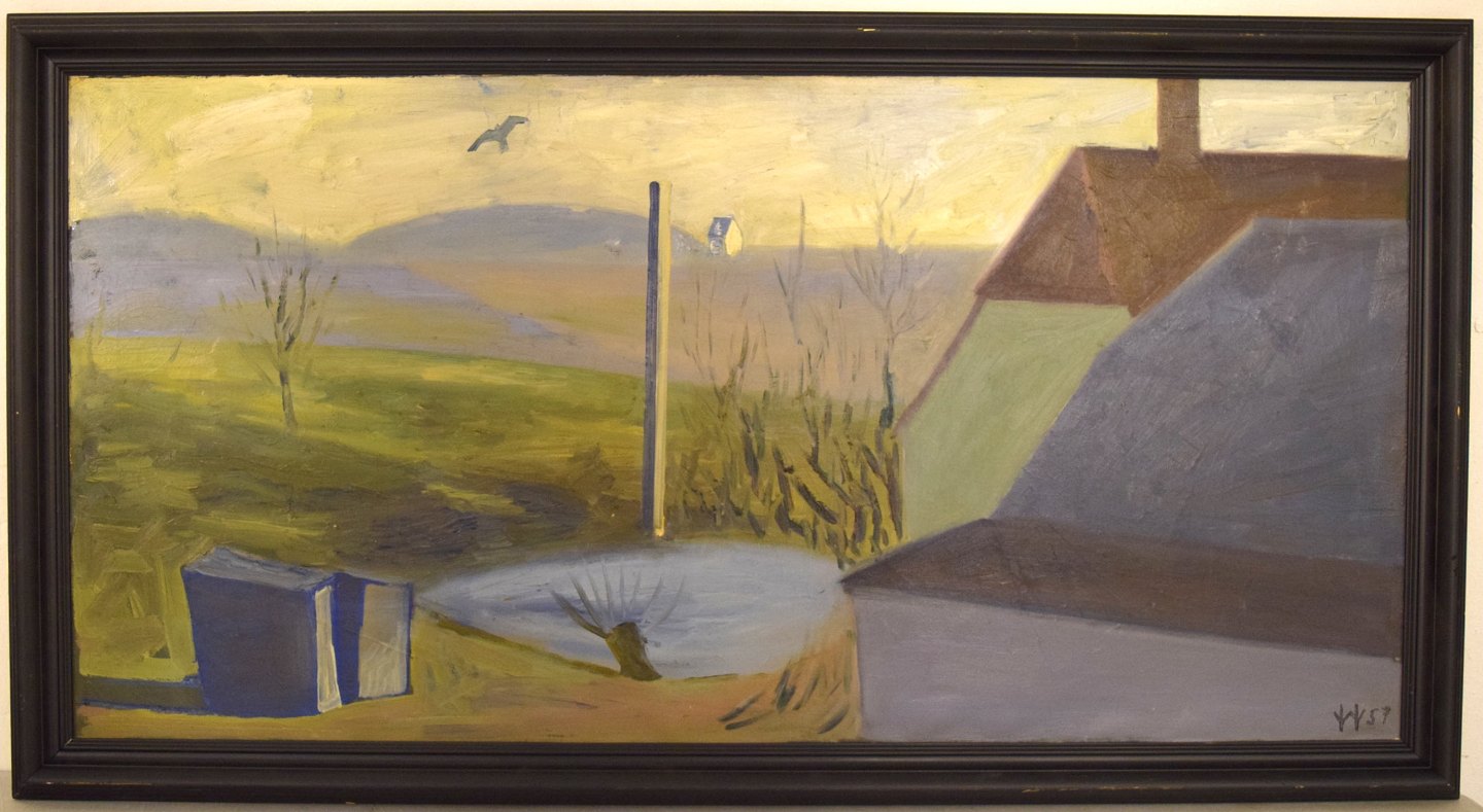 William Hansen (1908-1991), fynbomaler. Olie på lærred. Bakket landskab med husgavl og kirke i baggrunden. Dateret 1957. I flot stand. Signeret. Lærredet måler: 109 x 54 cm. Rammen måler: 5,5 cm.