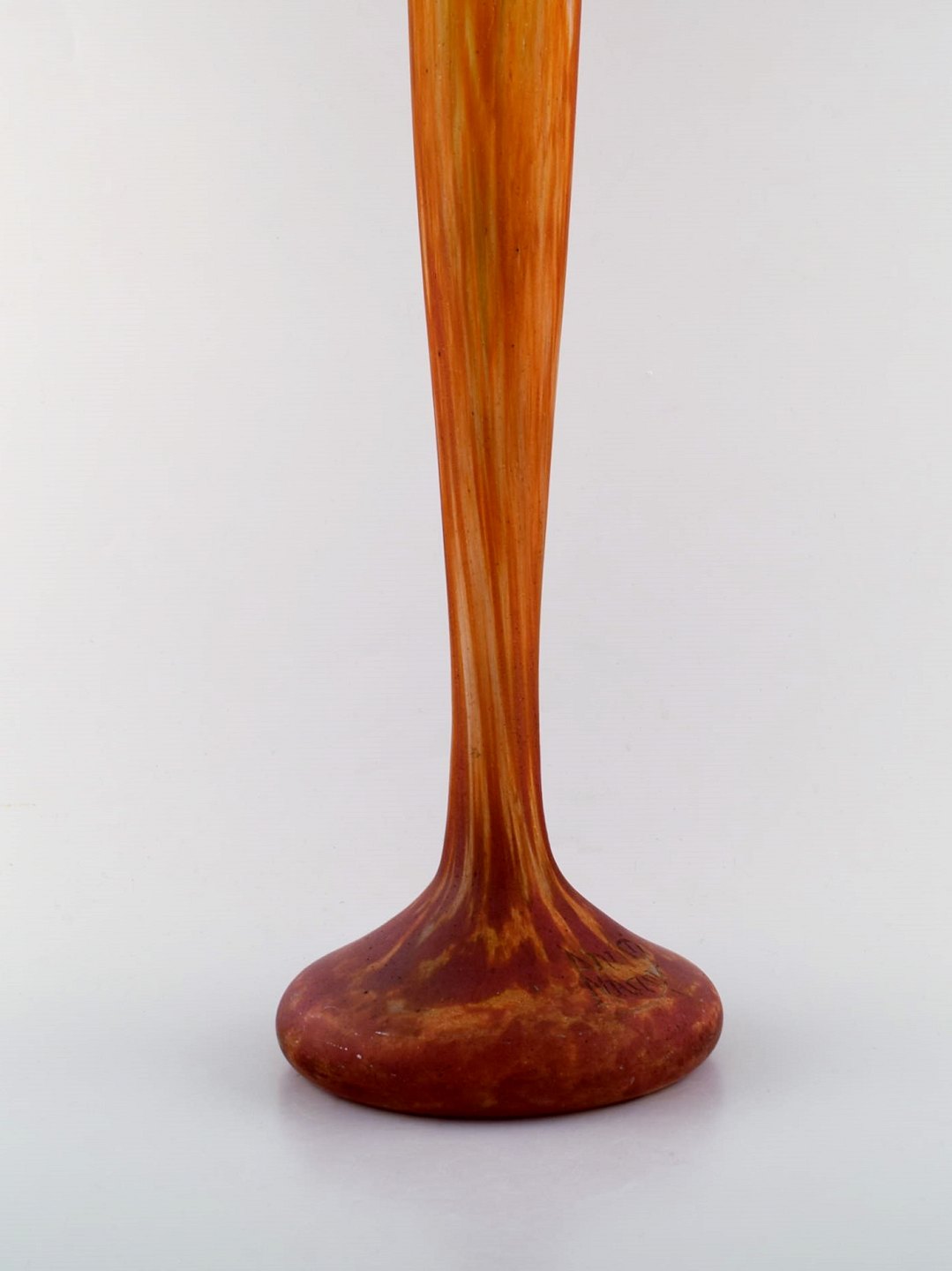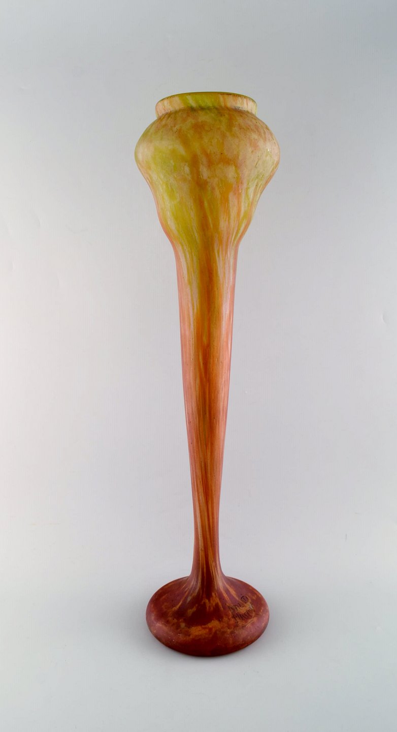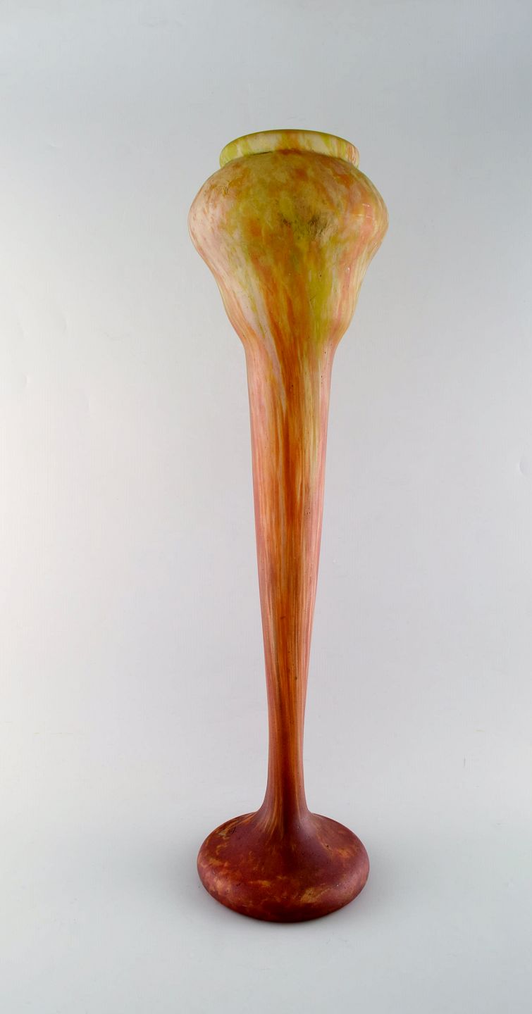 Meget stor Daum Nancy Pâte de verre vase. Art nouveau. Smukke farver i røde, gule og grønne nuancer. Ca. 1910. I flot stand. Indridset signatur. Måler: 60 x 16,5 cm.