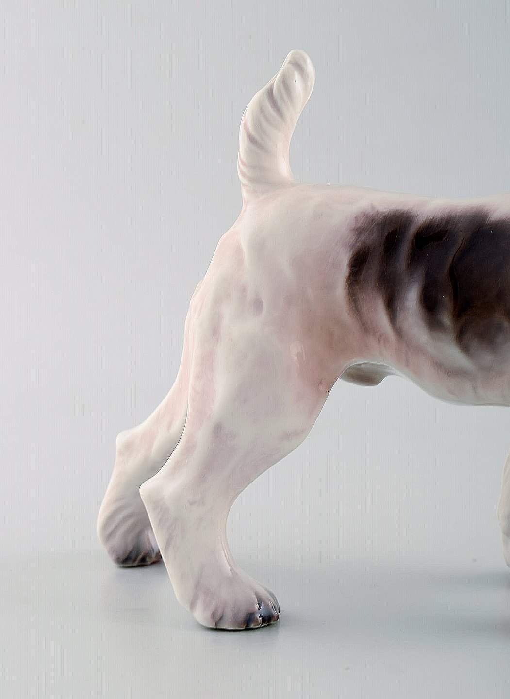 Dahl Jensen porcelænsfigur. Ruhåret foxterrier. Modelnummer 1009. 1. Sortering. 1930'erne. I flot stand. Måler: 21,5 x 14 cm. Signeret: Kongekrone , DJ Copenhagen.