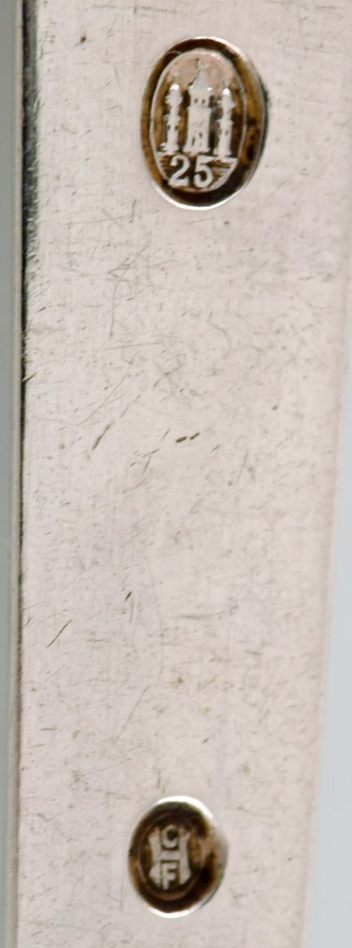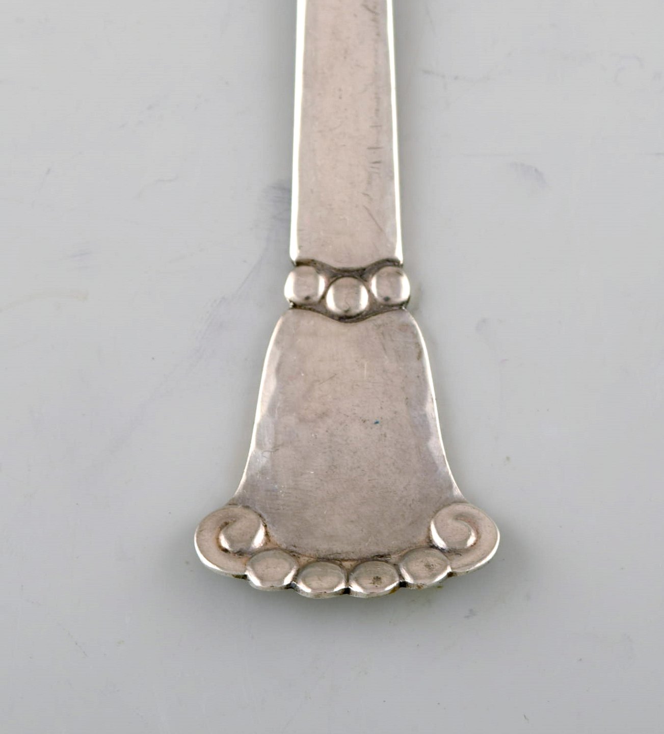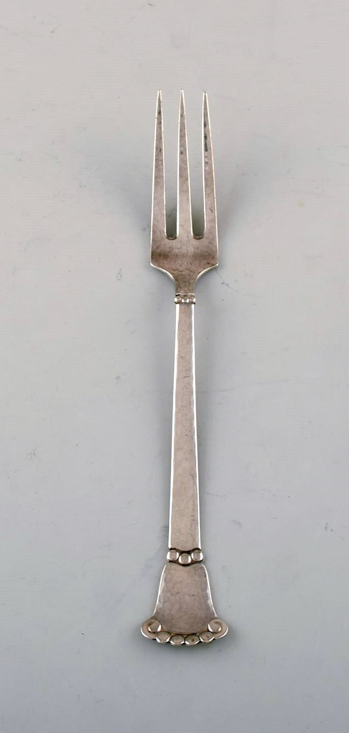 Dansk sølvsmed. "Kugle" middagsgaffel i hammerslået sølv. Dateret 1925. To stk på lager. Stemplet : CFH : Christian Fr. Heise stadsguardein. 1910/20'erne. I flot stand. Måler: 20,5 cm. Stemplet og dateret.
