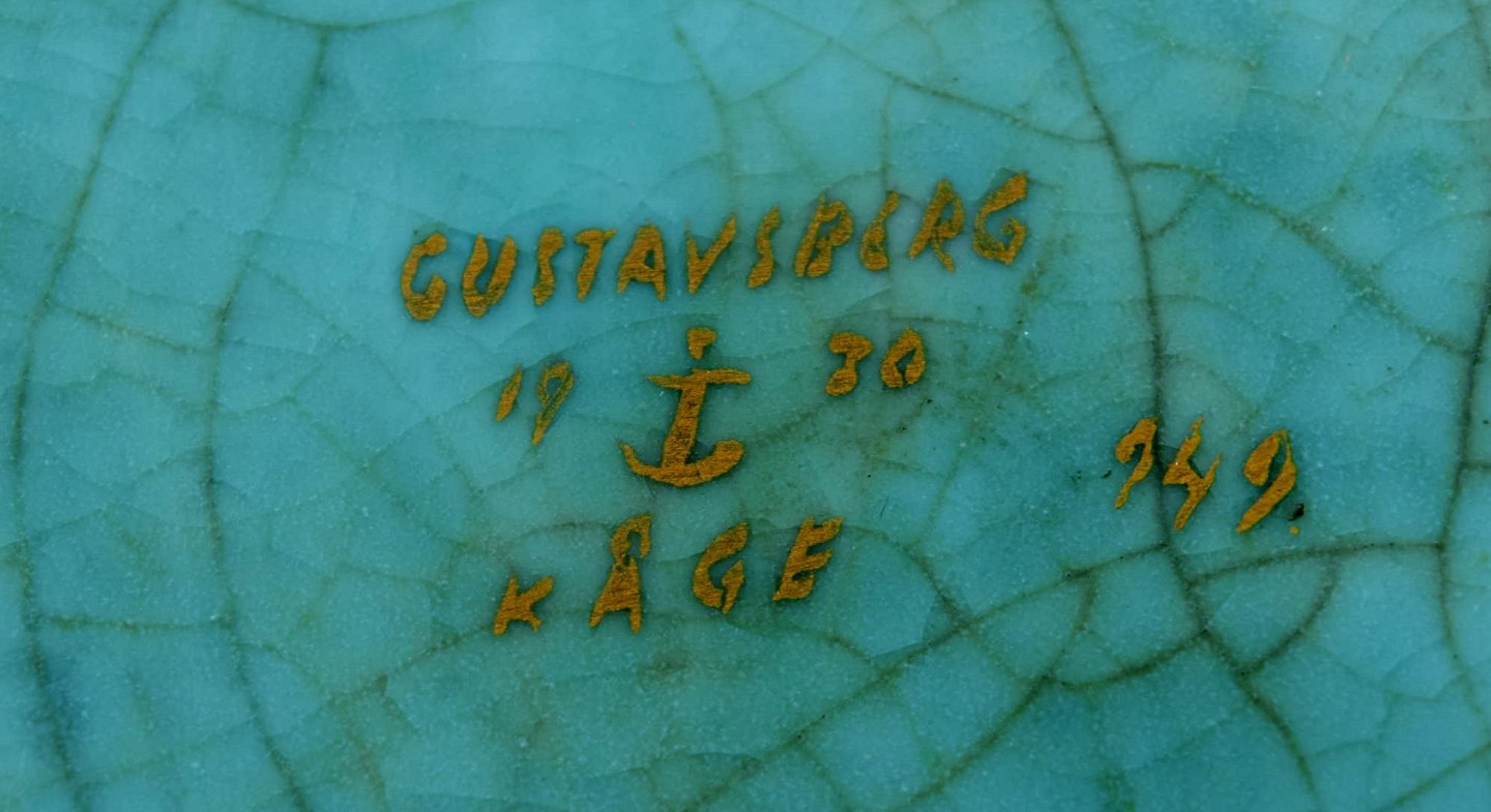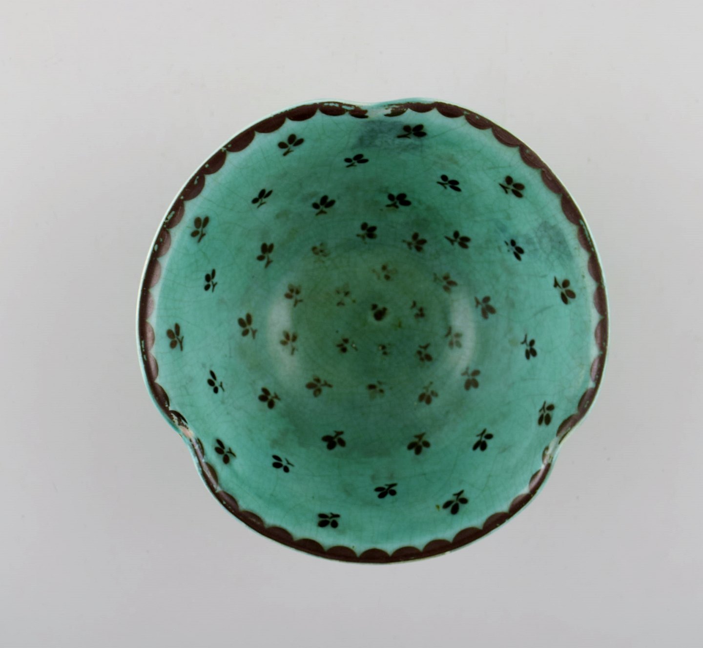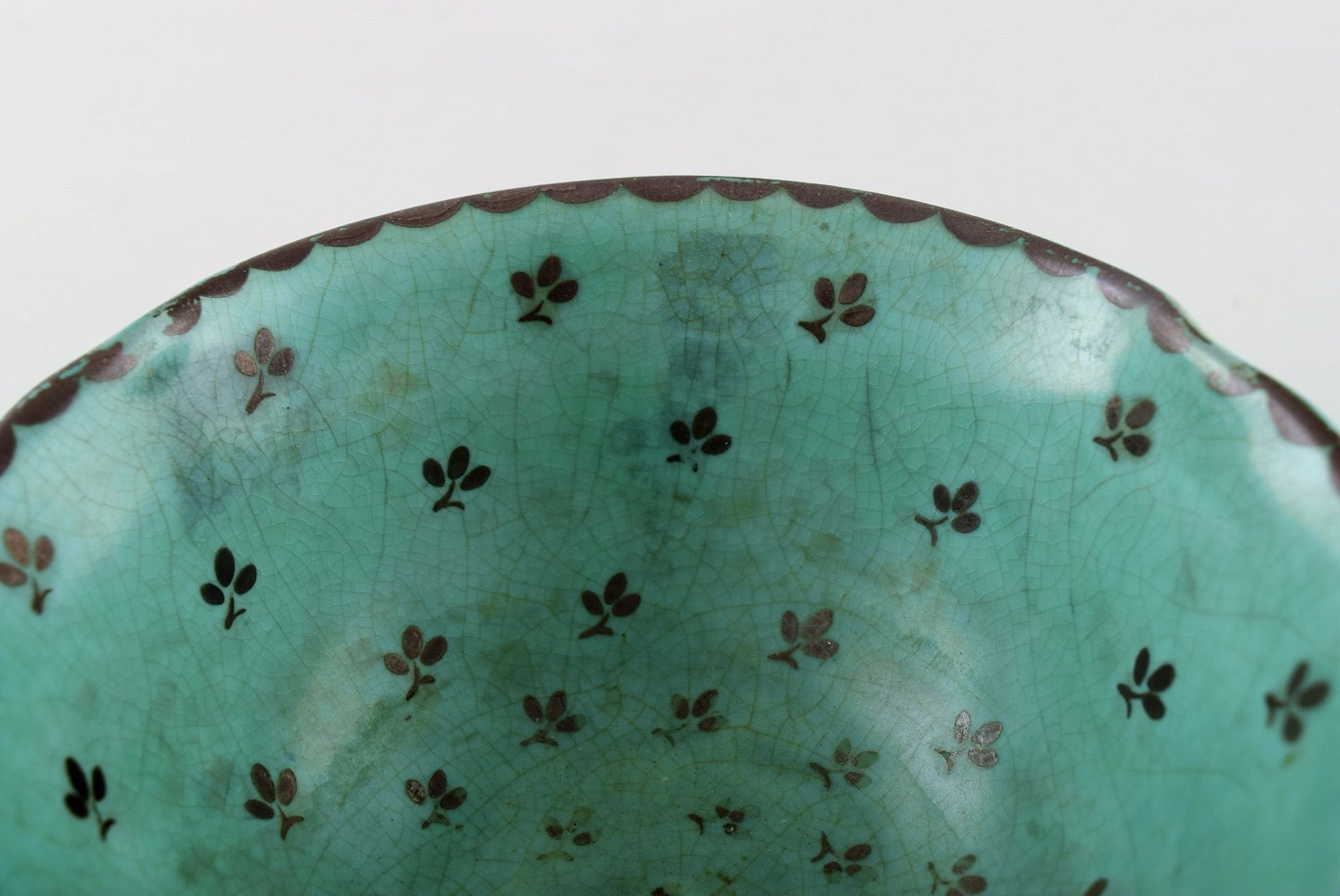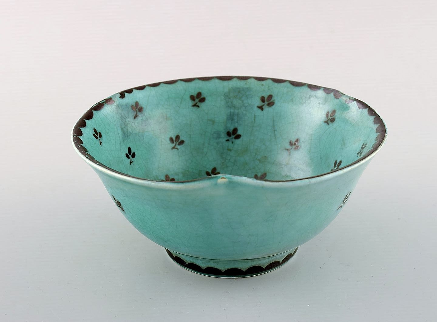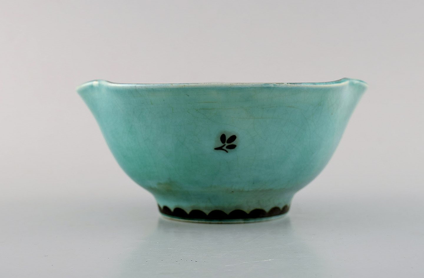 Wilhelm Kåge for Gustavsberg. Argenta bowl in ceramics decorated with leaves in silver inlaid. Sweden 1940's. Measures: 15,5 x 7,5 cm. Stamped: Gustavsberg, Kåge. In very good condition.