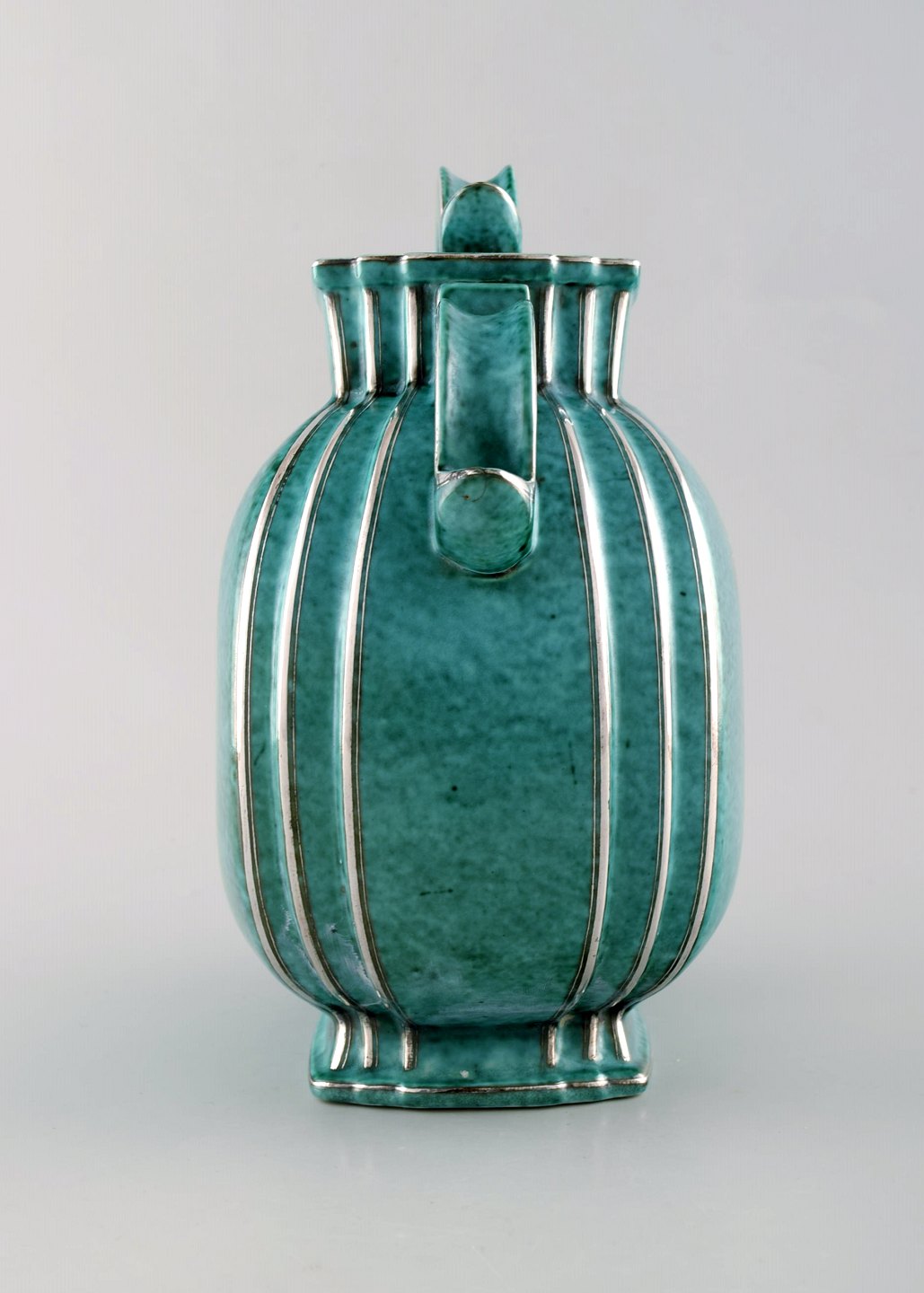 Wilhelm Kåge for Gustavsberg. Stor Argenta art deco lågkrukke i glaseret keramik dekoreret med sølvindlæg.