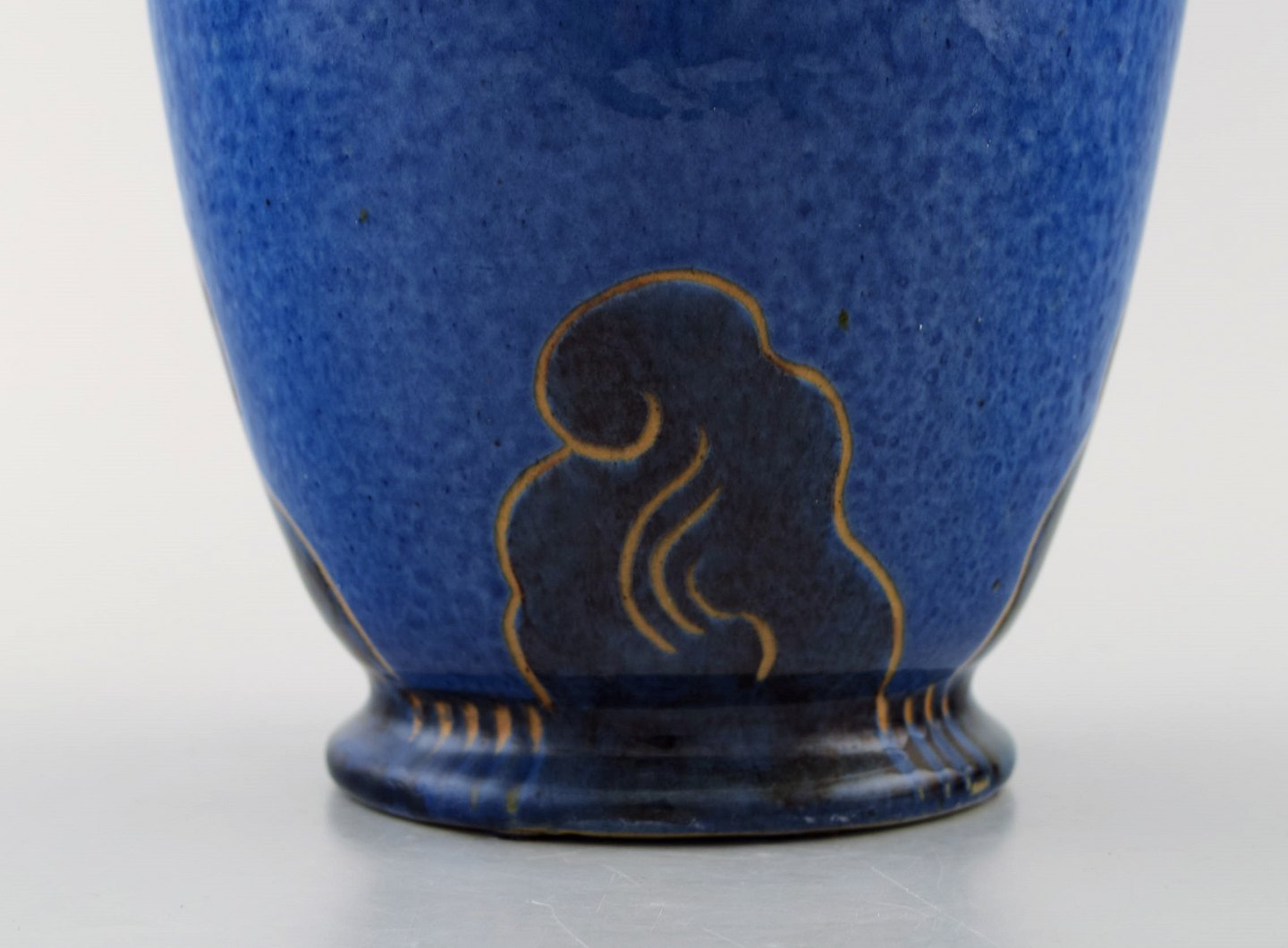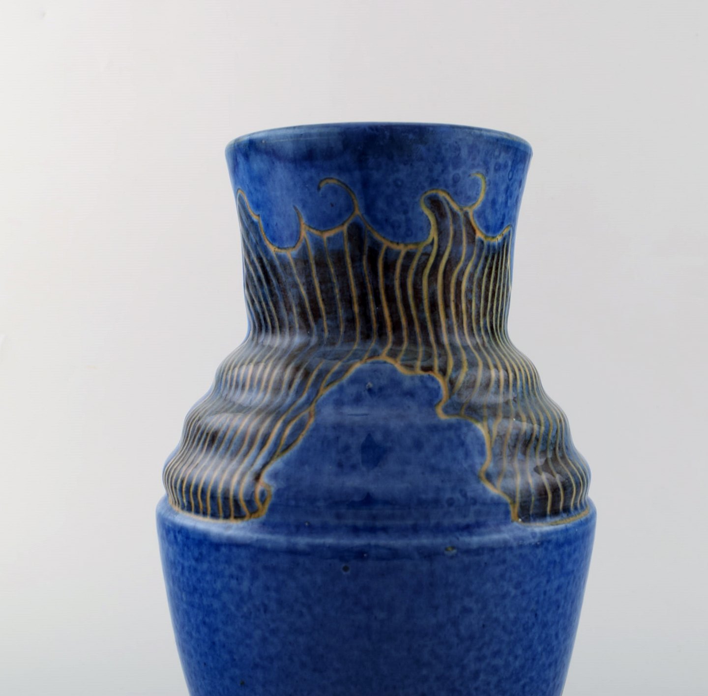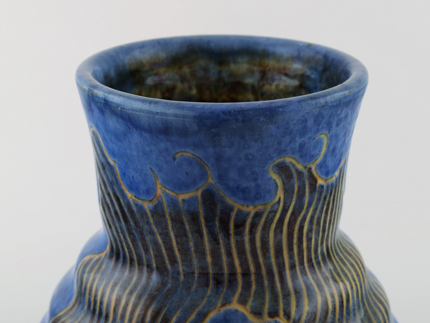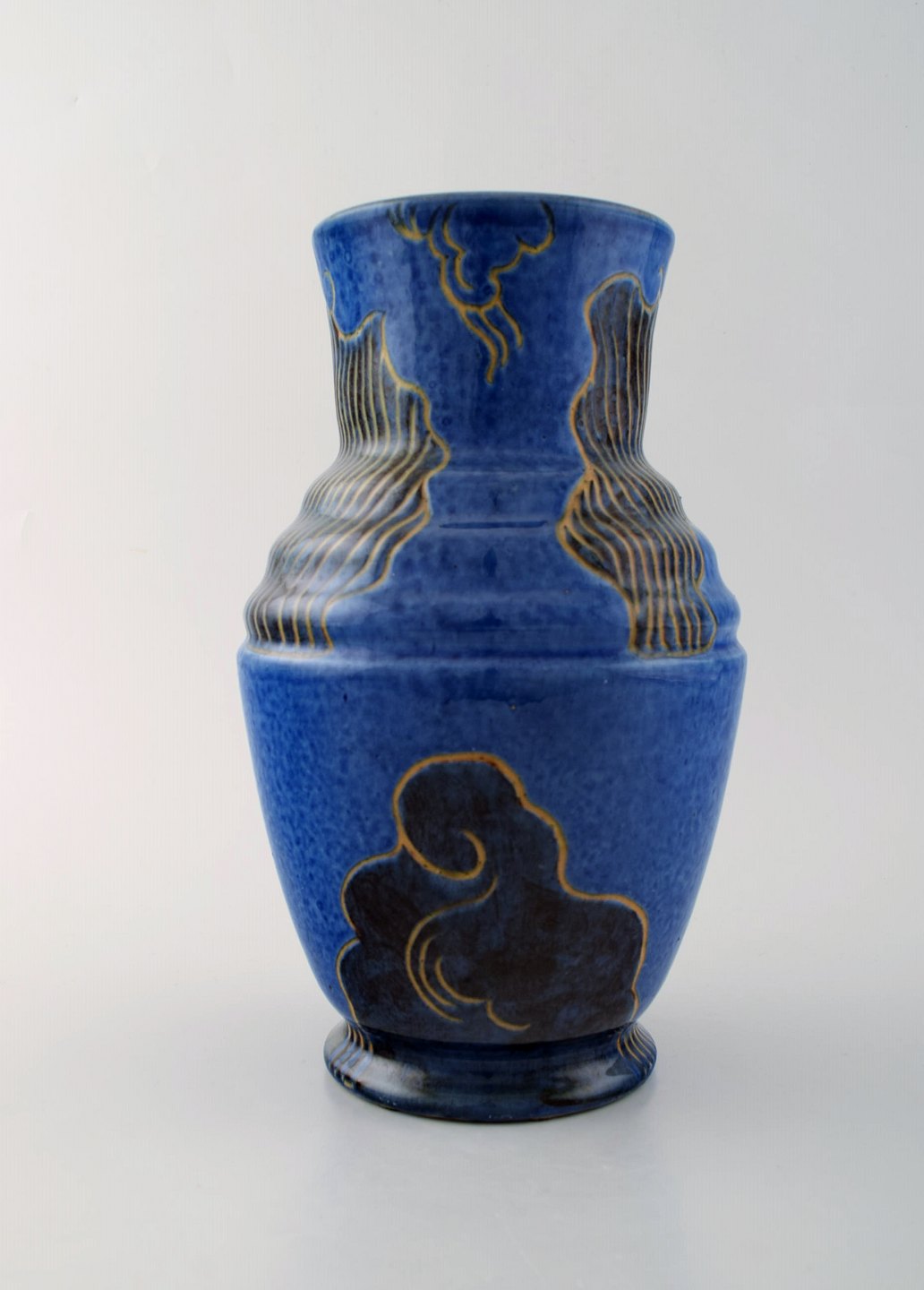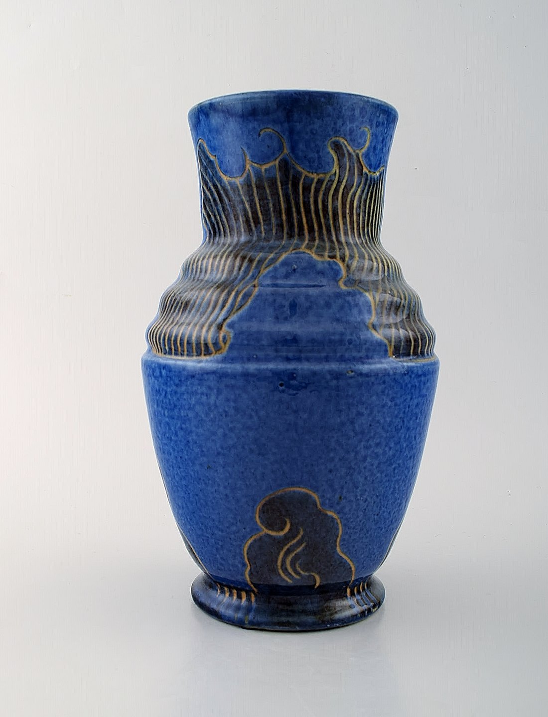 Møller & Bøgely. Skønvirke keramikvase i glaseret keramik. Smuk glasur i blå nuancer. Ca. 1920. Måler: 25,5 x 17 cm. I flot stand. Stemplet. Stor dansk privatsamling af Møller & Bøgely keramik på lager.