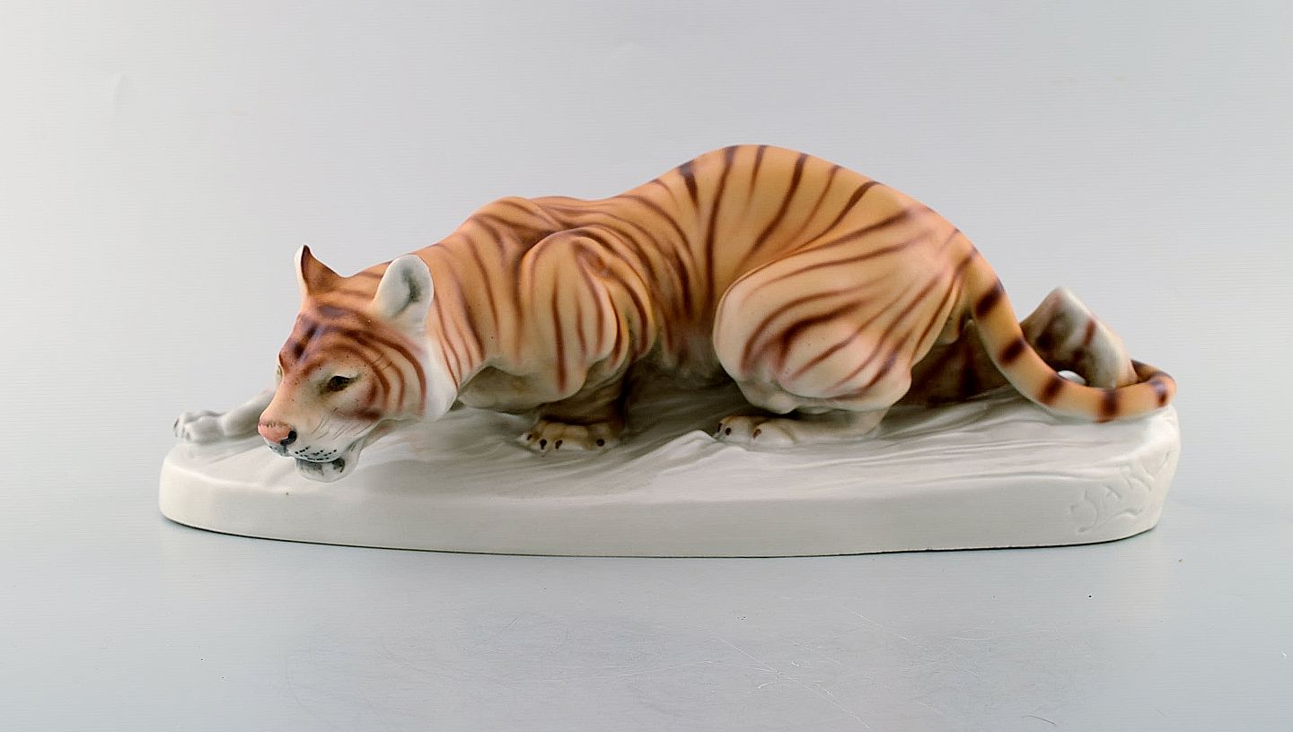 Otto Jarl for Royal Dux. Stor imponerende porcelænsfigur af krybende tiger. 1940'erne. Måler: 38 x 14 cm. Stemplet. I flot stand.