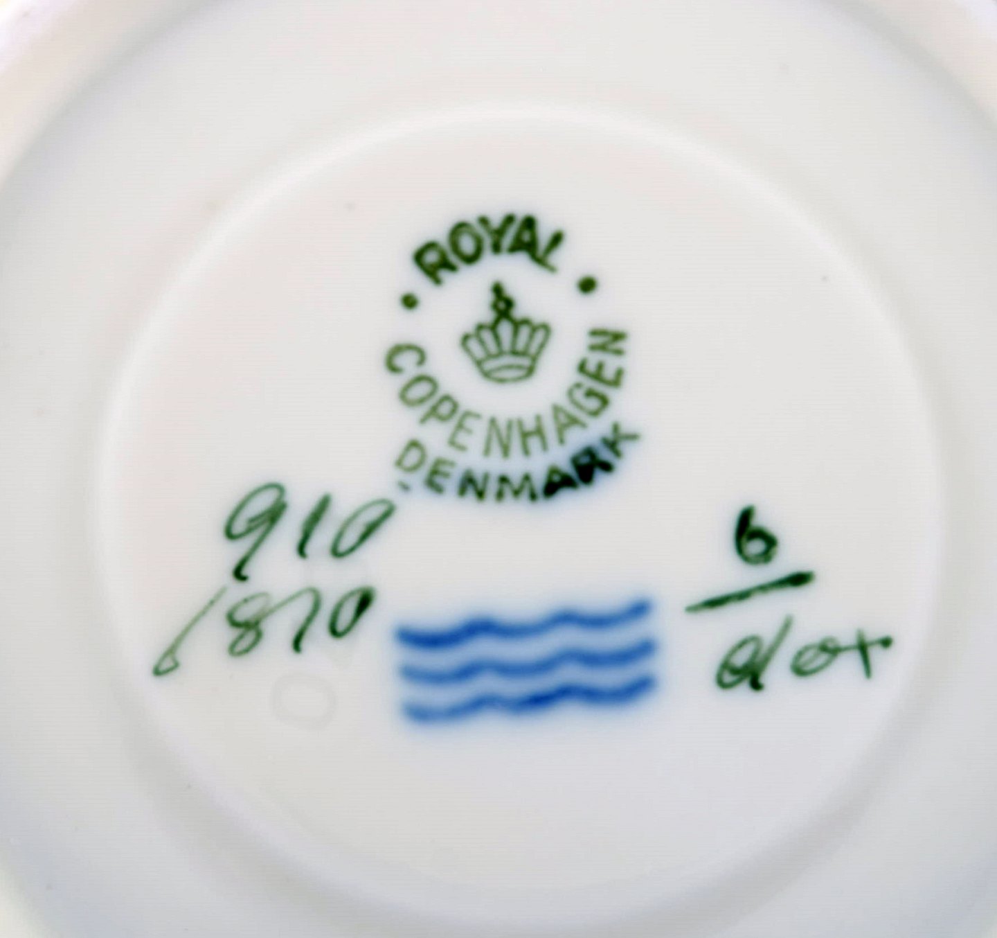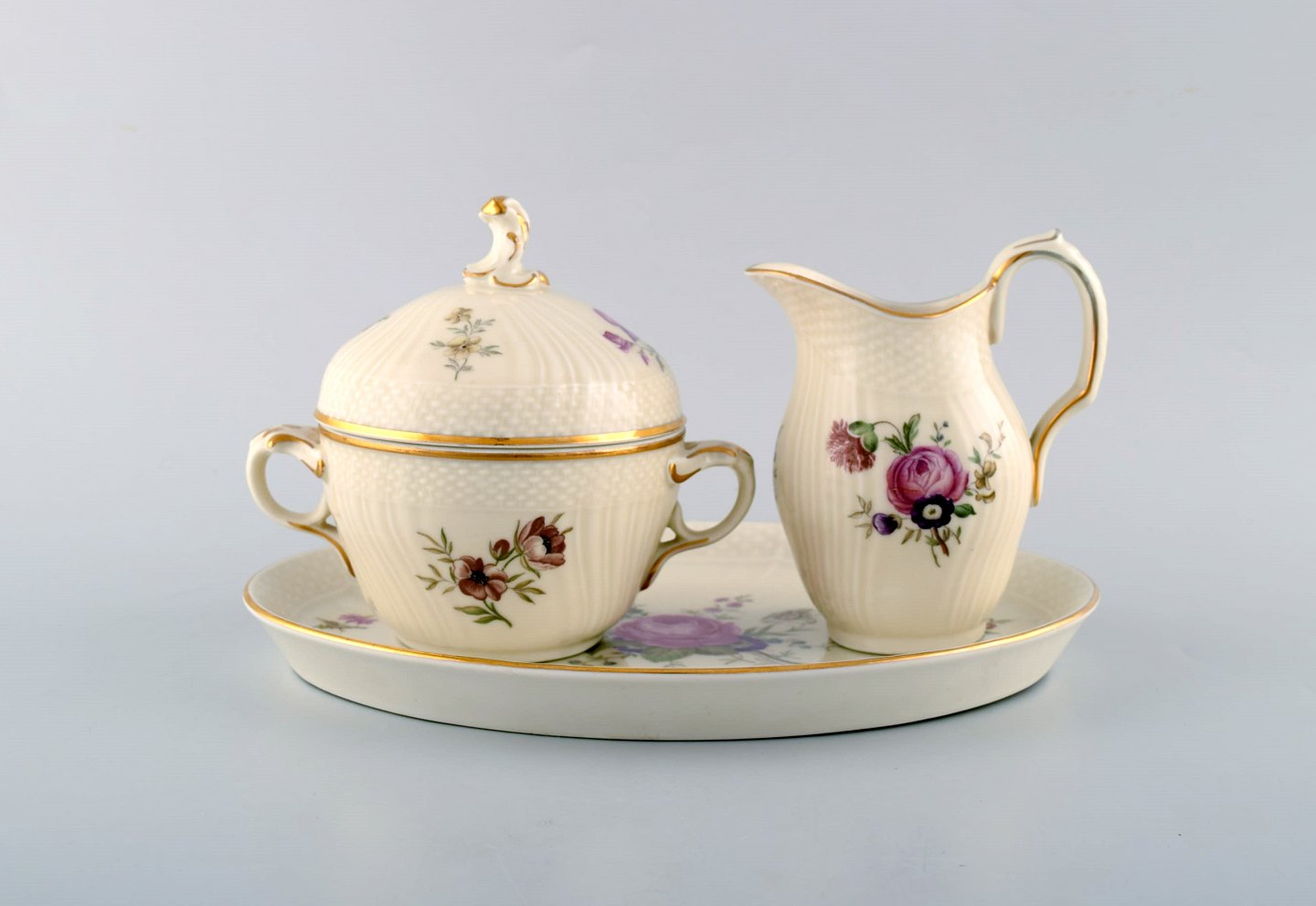 Royal Copenhagen. "Frisenborg". Fem kaffekopper med underkop og suker/fløde sæt. Stemplet. I flot stand. Koppen måler: 8 x 6,5 cm. Underkoppen måler: 15 cm. 1. og 2. Sortering.