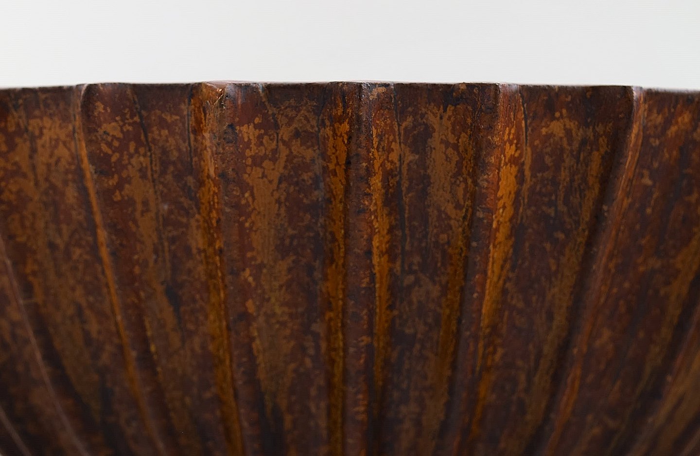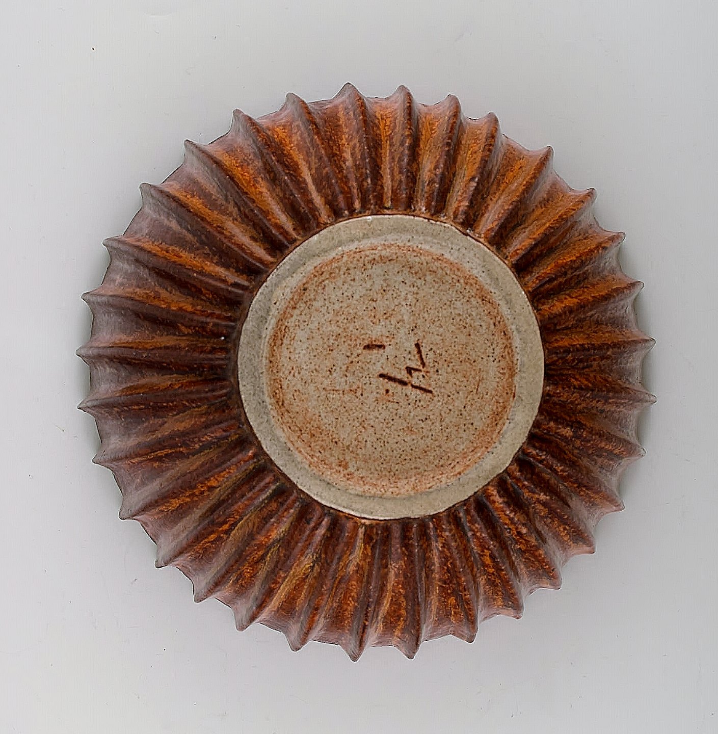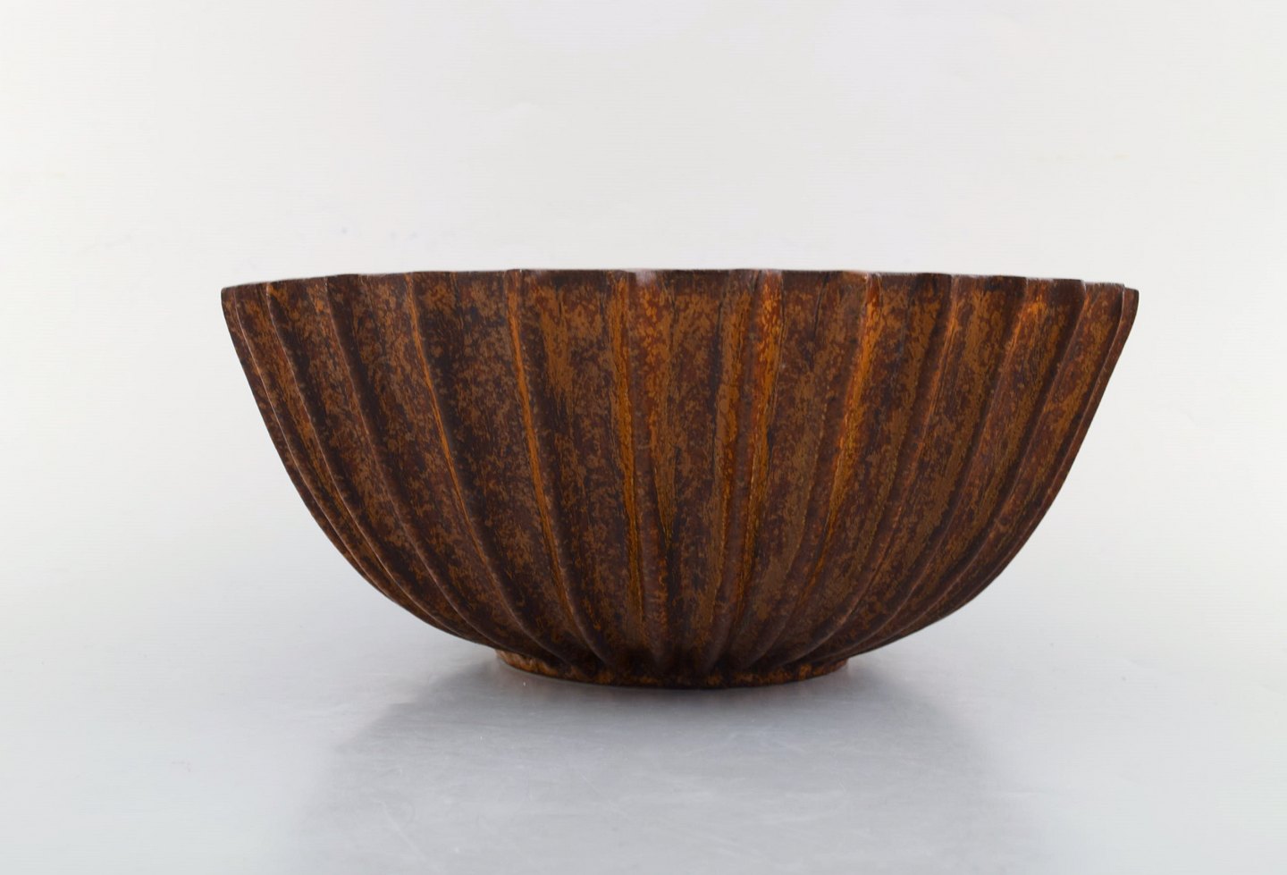 Arne Bang. Bordskål af stentøj med kanneleret korpus. Dekoreret med smuk spættet glasur i rødbrune nuancer. 1930'erne.