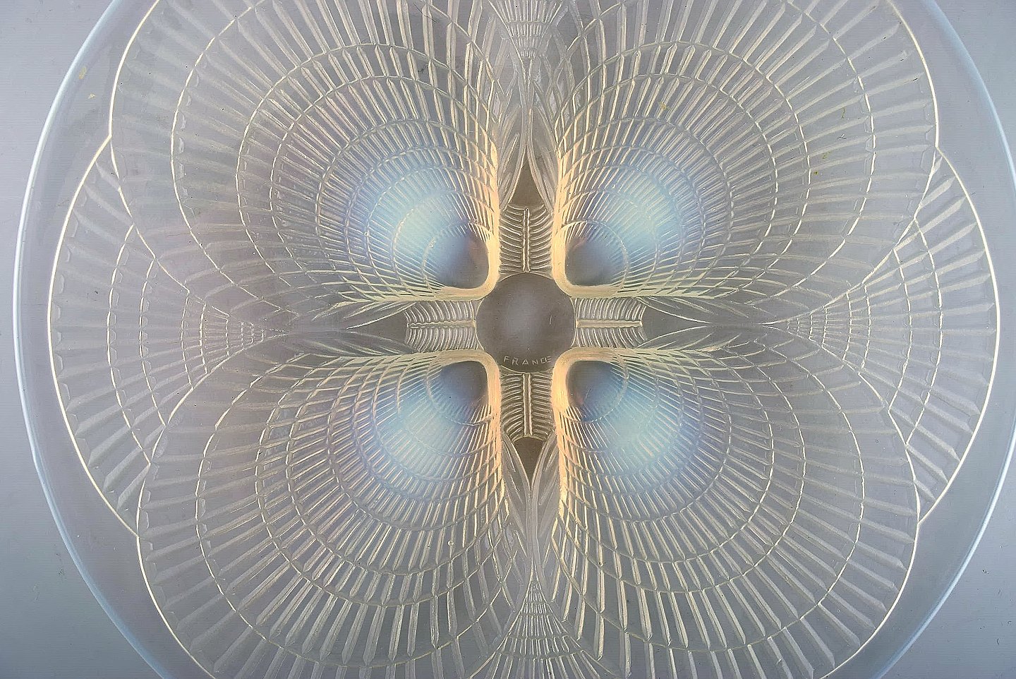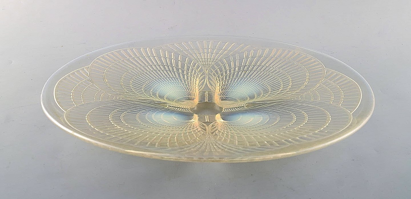 Tidligt René Lalique "Coquilles" fad i kunstglas dekoreret med muslingeskaller. Dateret før 1945. Stemplet: R. Lalique France. I flot stand. Måler: 30 x 4 cm.