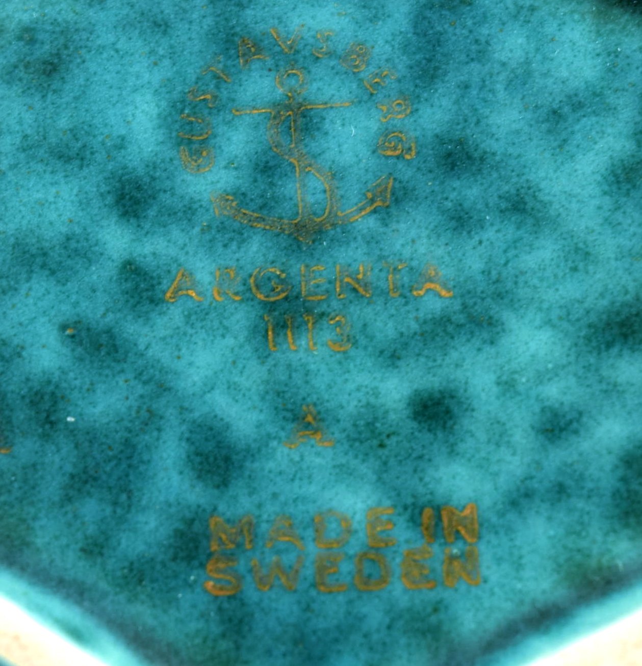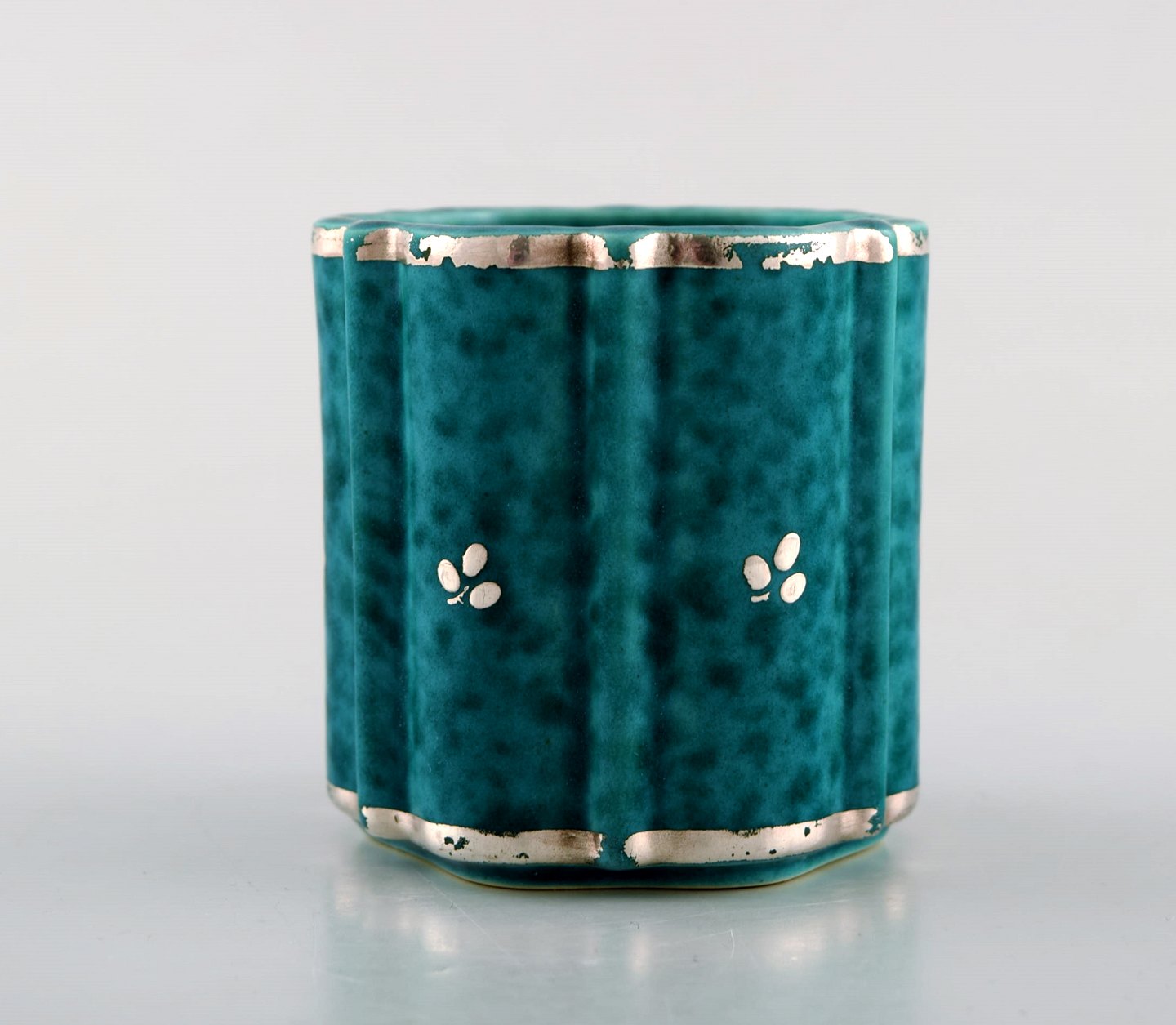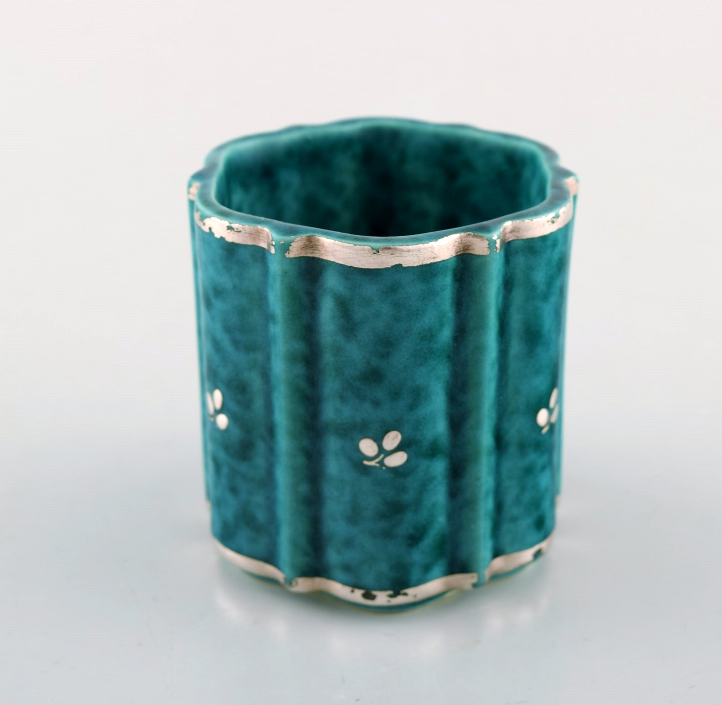 Wilhelm Kåge for Gustavsberg. Argenta vase in ceramics decorated with leaves in silver inlaid. Sweden 1940's. Measures: 6,5 x 6,5 cm. Stamped: Gustavsberg, Kåge. In very good condition.