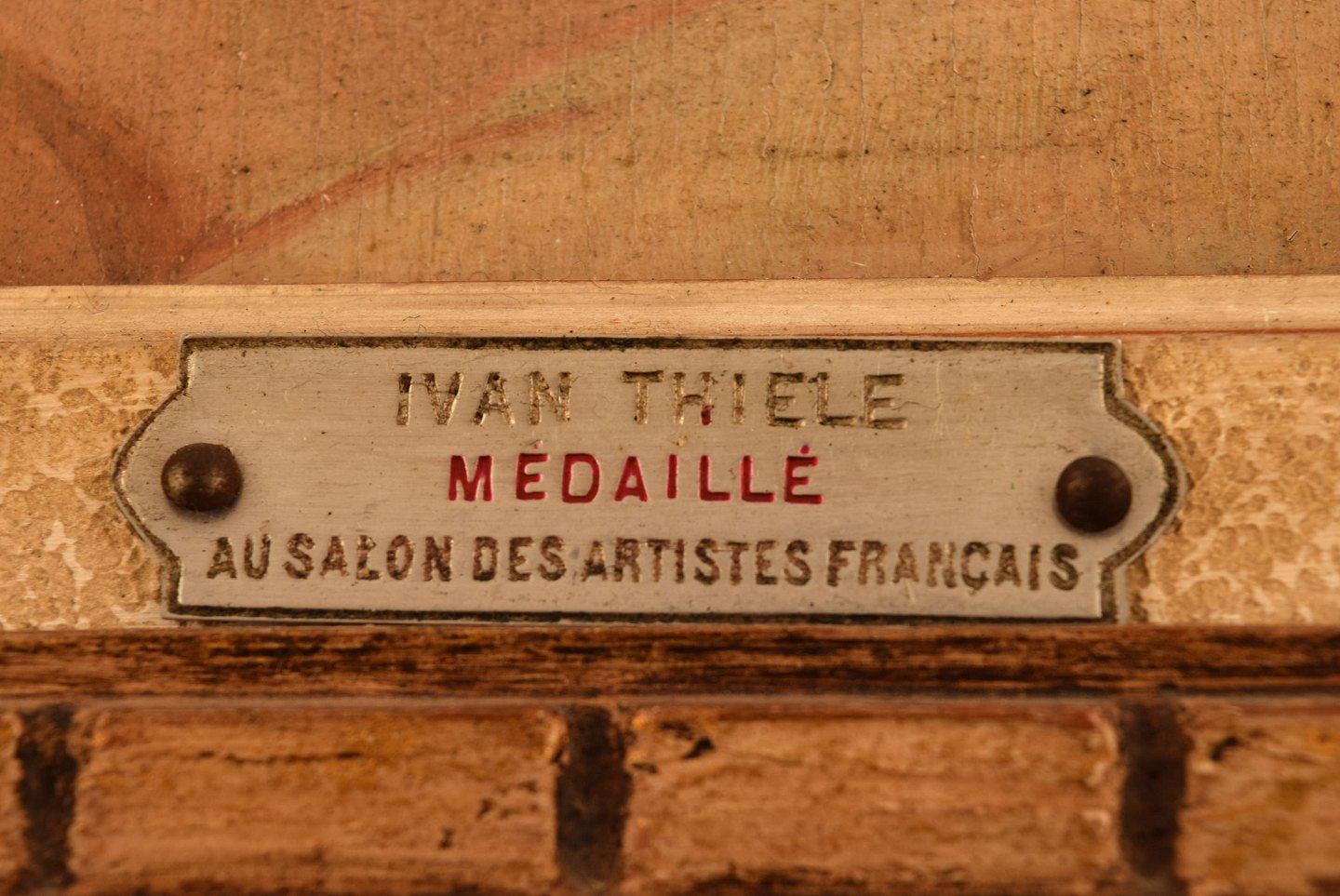 Ivan Thiele, Rusland. Olie på plade. Nøgen kvinde poserer. Ca. 1920. I flot stand. Signeret. Pladen måler: 54 x 44 cm. Rammen måler: 10 cm.