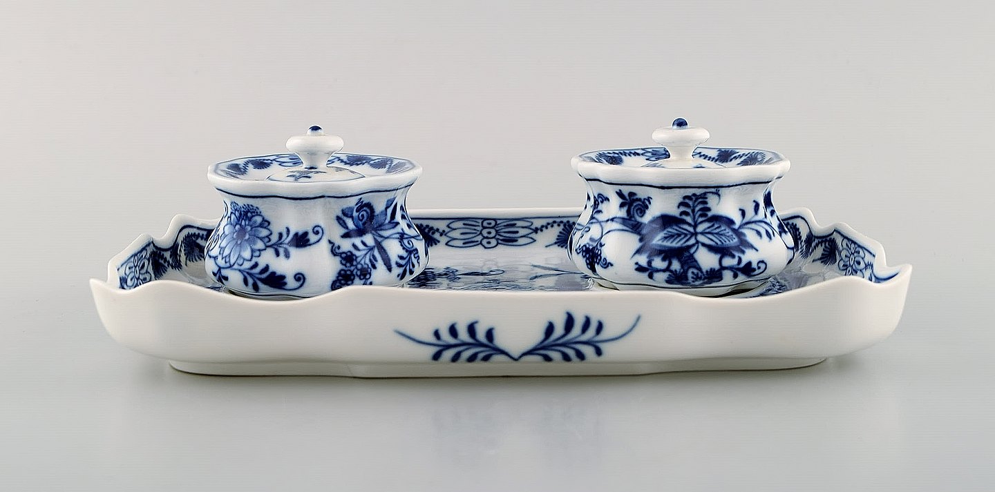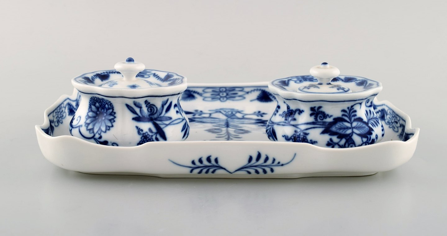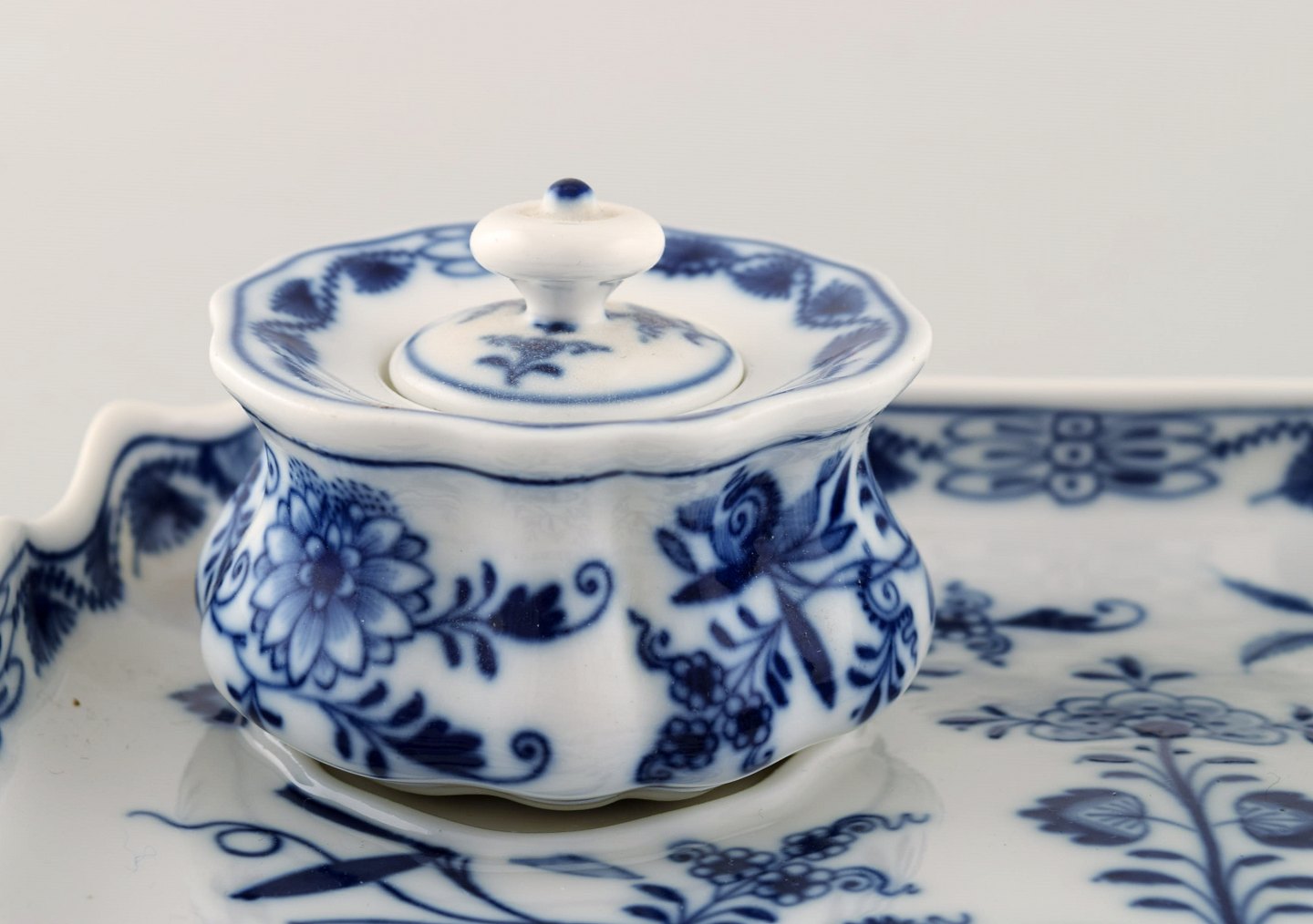 Meissen Blue Onion ink well in hand painted porcelain. 1930-50's. Measures: 22.5 x 15.5 cm. In very good condition. Stamped. 2nd factory quality.