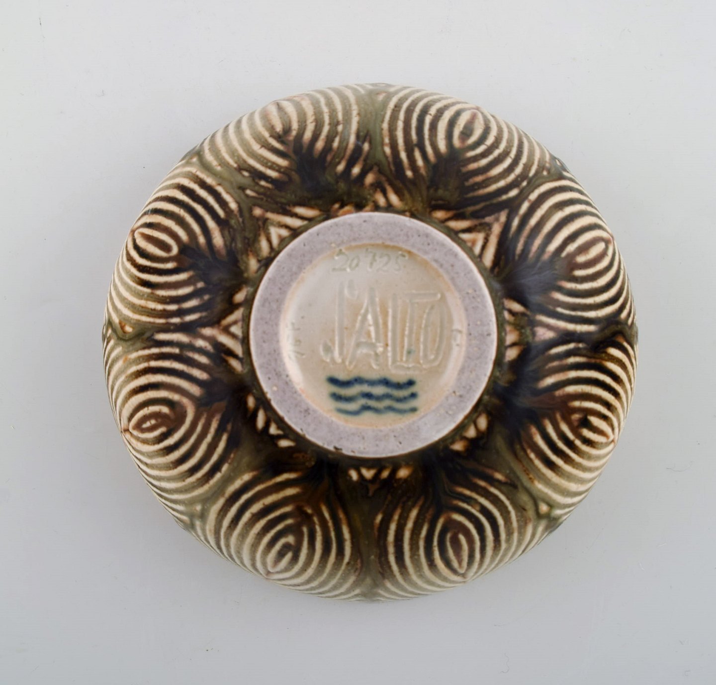 Axel Salto (1889-1961) for Royal Copenhagen. Skål af glaseret stentøj med riflet korpus. Smuk glasur i brune og lyse nuancer. Modelnummer 20725. 1930/40'erne. Stemplet. I flot stand. Måler: 14,5 x 5,7 cm.