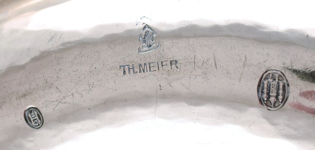 Thorvald Nielsen Meier, København 1917-1948. Stor bådformet skønvirke opsats med låg i hammerslået sølv. Københavnermester. Dateret 1917.