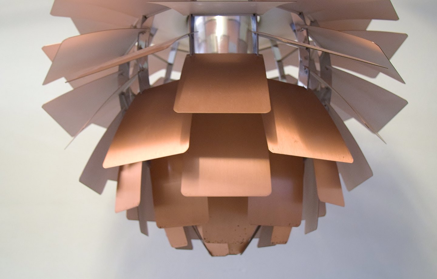 Poul Henningsen for Louis Poulsen. "Koglen" pendel. Overskærm af mathvidt metal, blade af lakeret kobber, ophæng med integreret stålline. Ca. 1970.