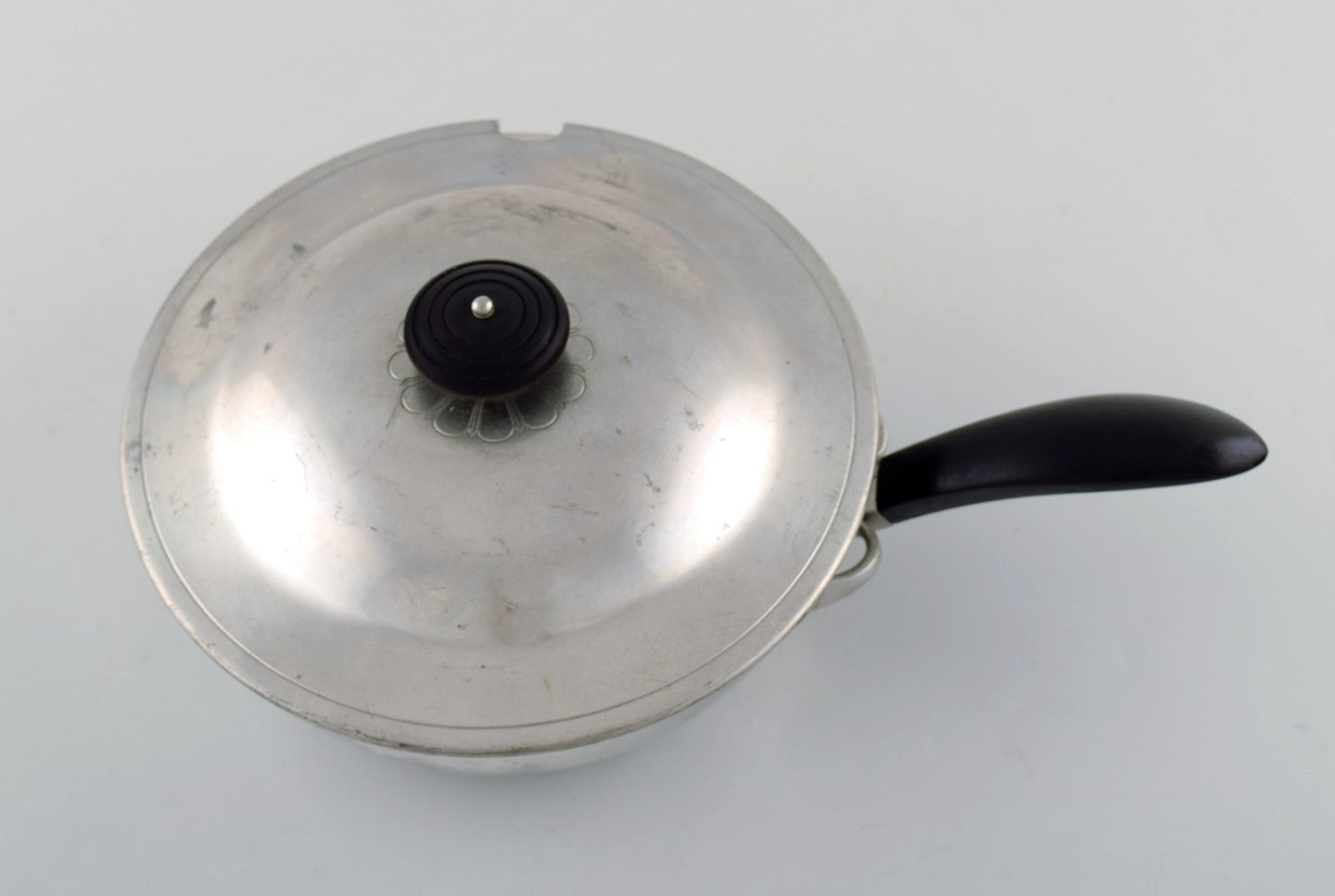 Just Andersen, Danmark. Sjælden art deco lågkasserolle i tin med knop og hank i bakelit. Modelnummer 1902. 1940'erne. Måler: 27 x 11 cm. I flot stand. Stemplet.