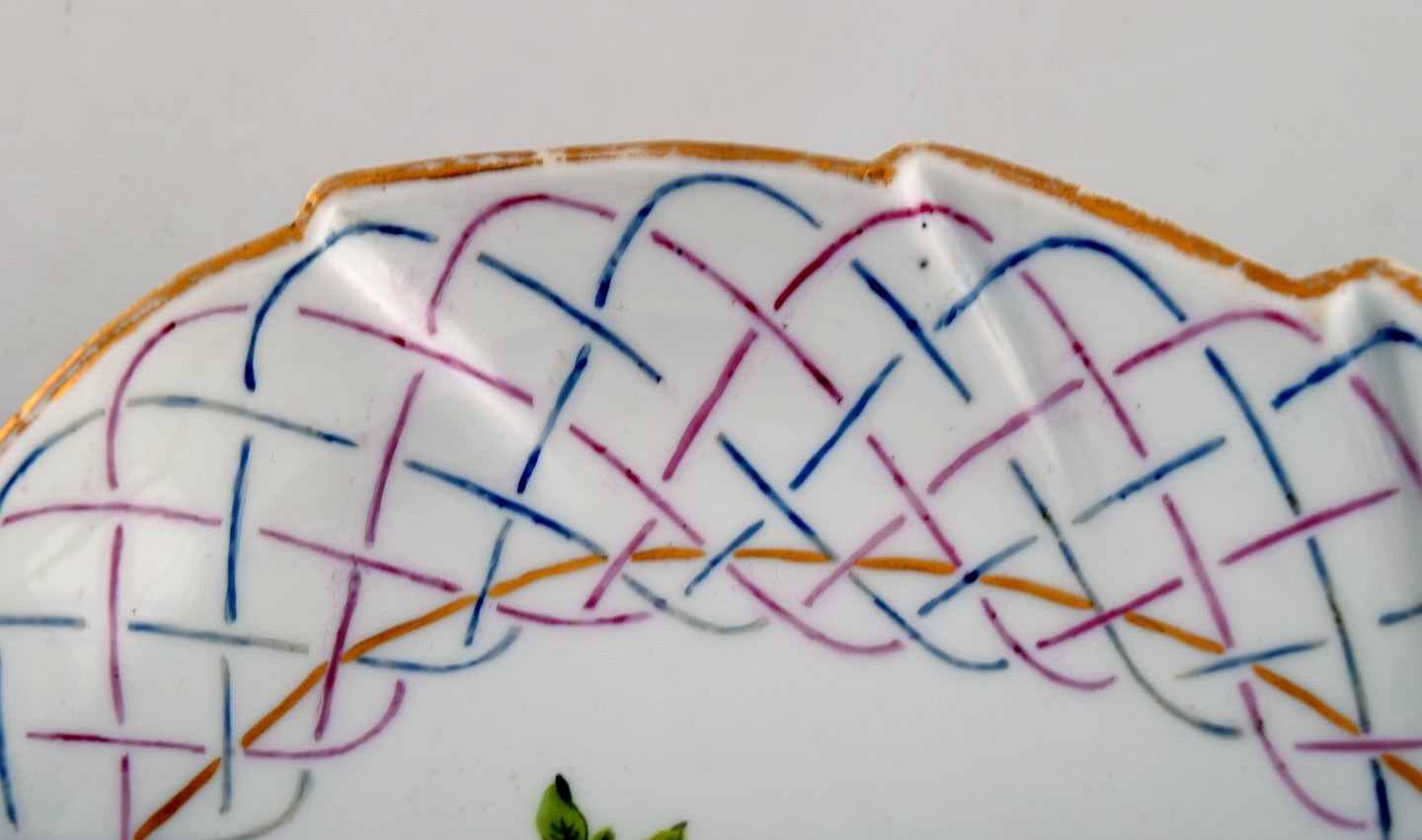 Antik håndmalet Meissen asiet med fuglemotiv og pousserende blomster. Midt 1800-tallet.
