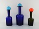 Otto Brauer for Holmegaard. En samling på fem store vaser/flasker i mørkeblåt og grønt kunstglas med låg i form af kugler. 1960'erne.
