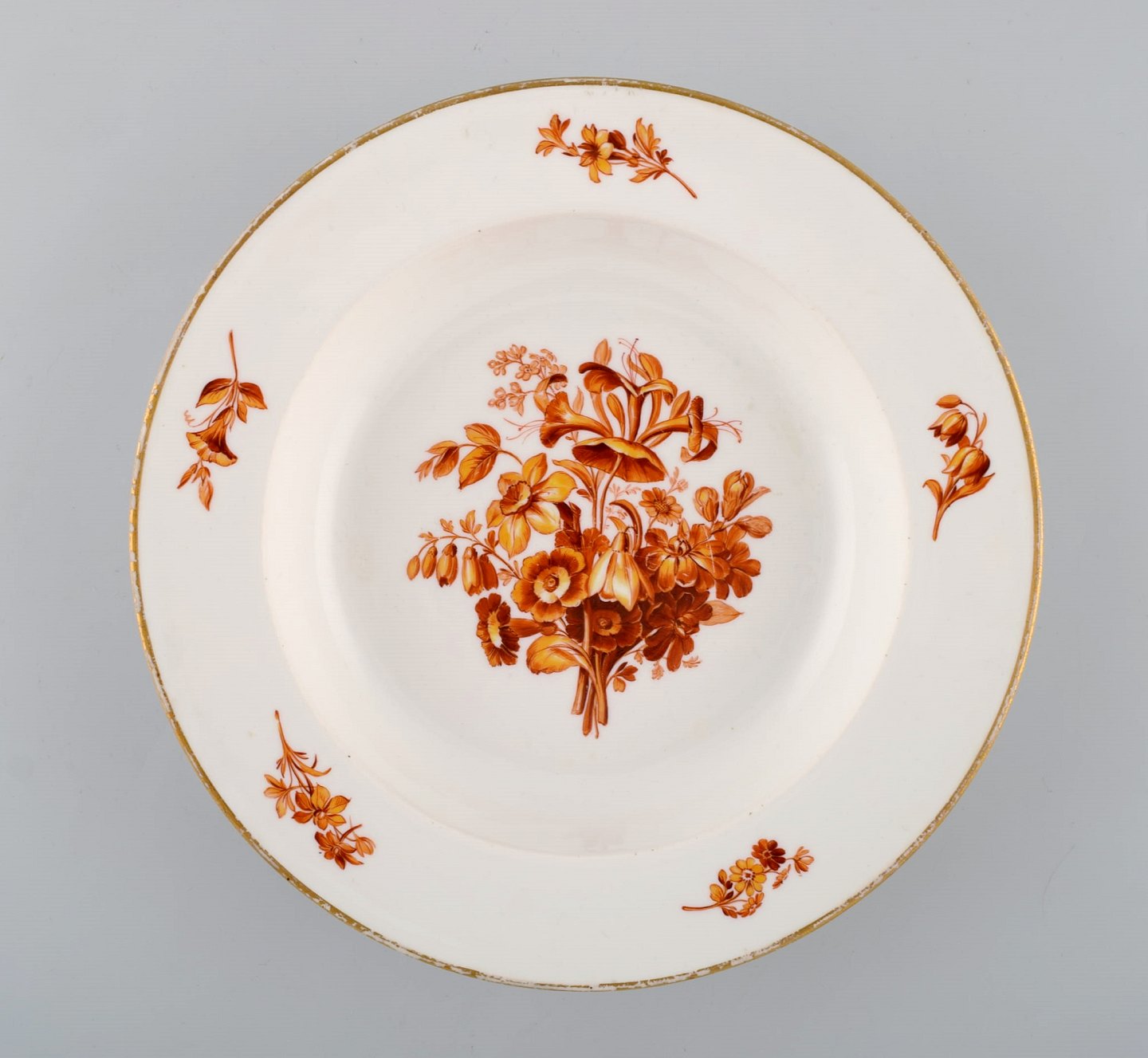 Tre antikke Meissen tallerkener i porcelæn med orange håndmalede blomster. To dybe tallerkener samt frokosttallerken. 1800-tallet.