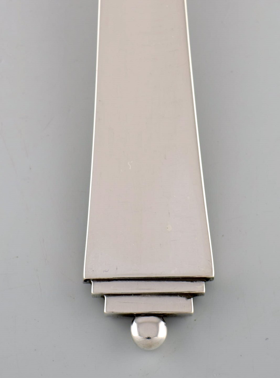 Georg Jensen Pyramide serveringsske i sterlingsølv. Dateret 1945-51. Længde: 22,5 cm. Designet af Harald Nielsen 1927. I flot stand. Stemplet.