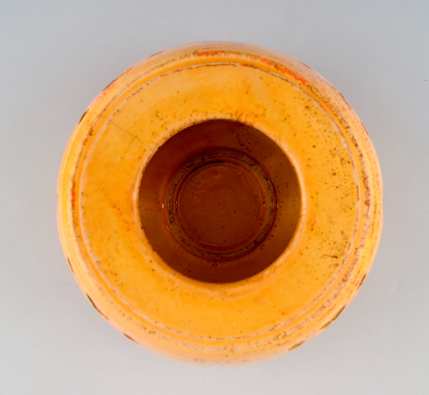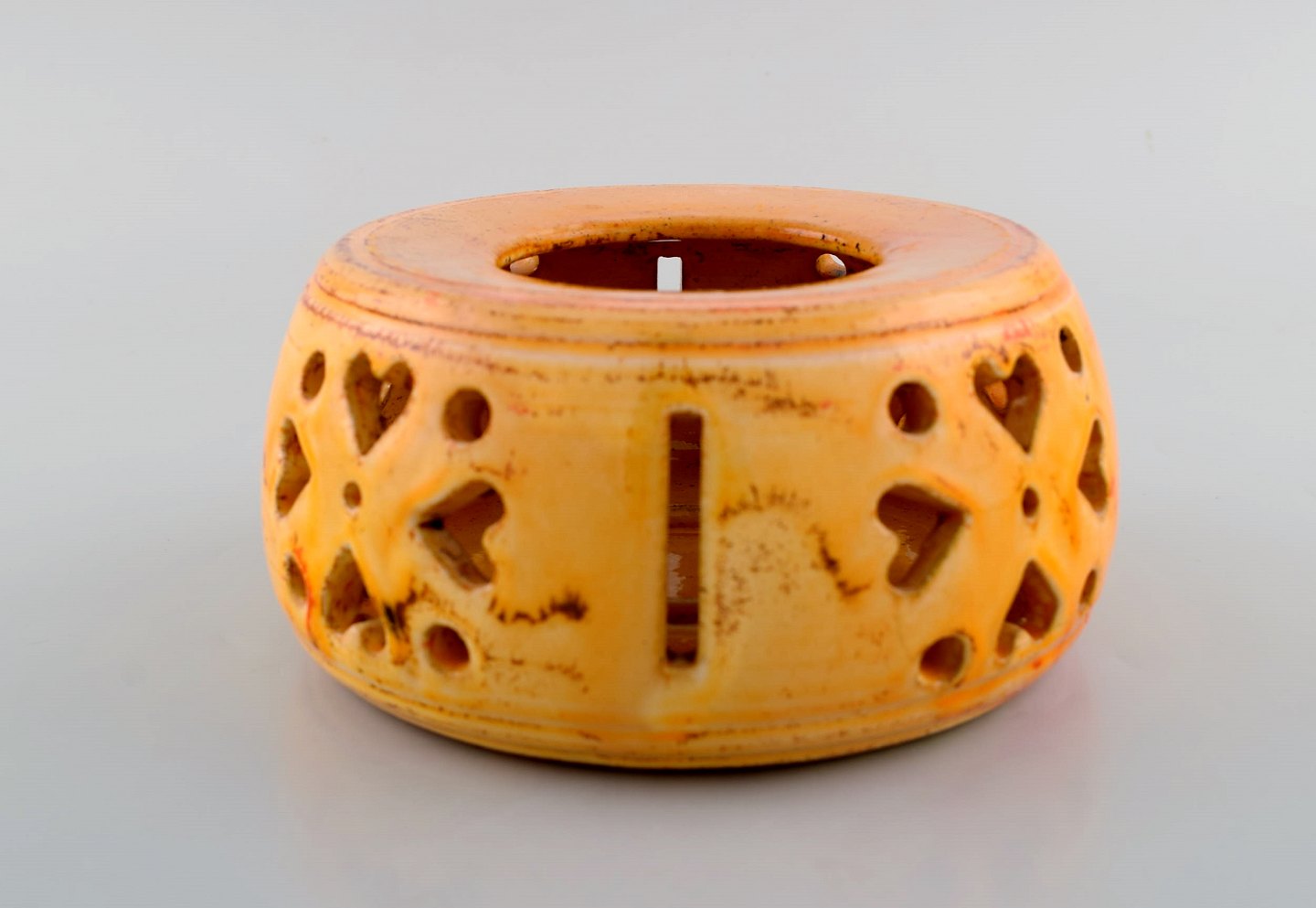 Kähler, HAK. Fyrfadsvarmer i glaseret stentøj. Smuk gul uranglasur. 1930/40'erne. Måler: 16 x 8 cm. Signeret. I flot stand.