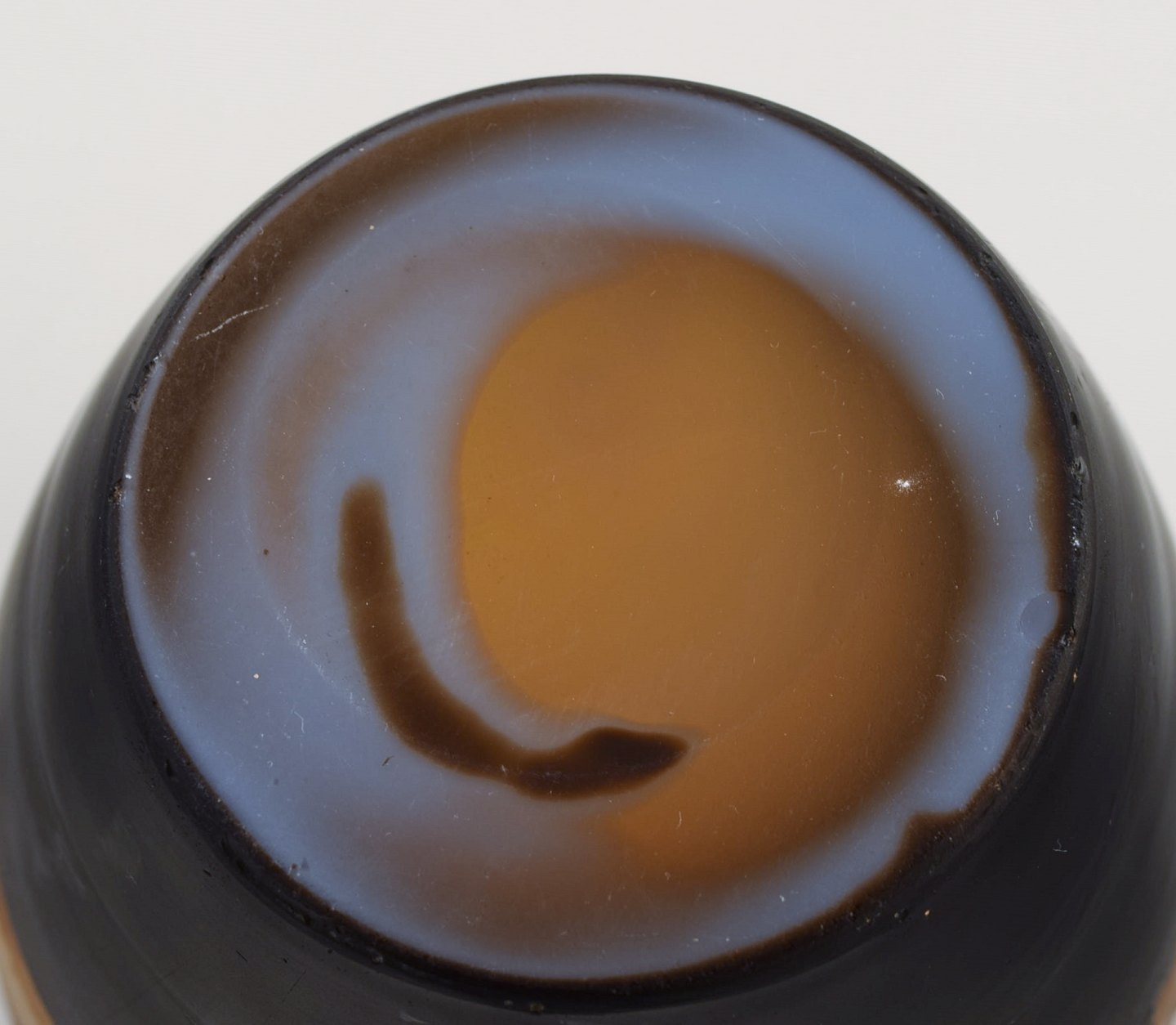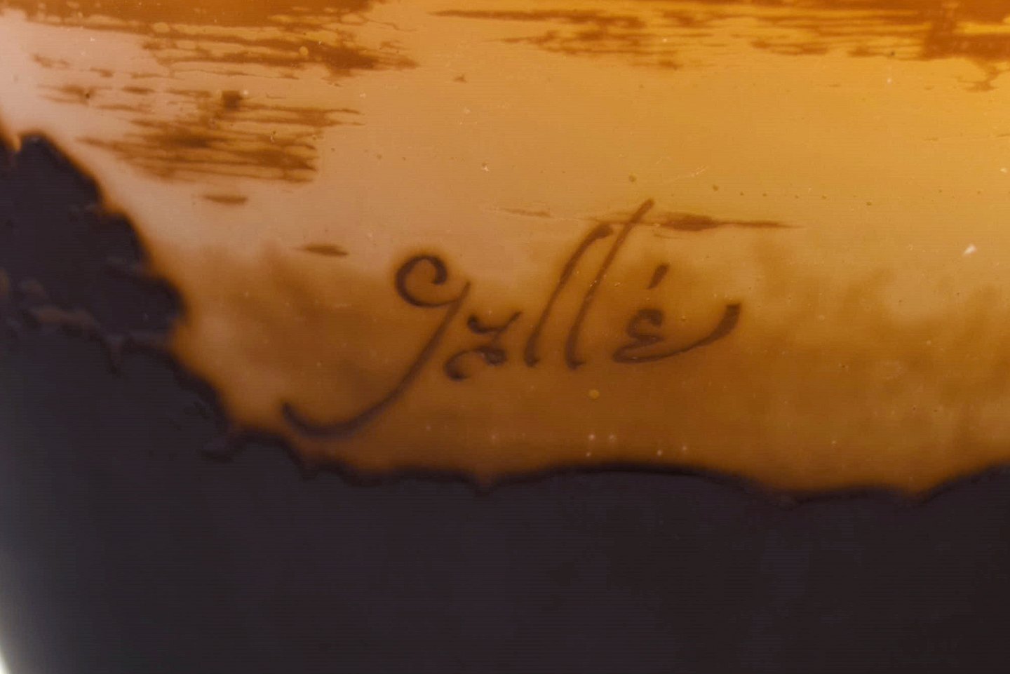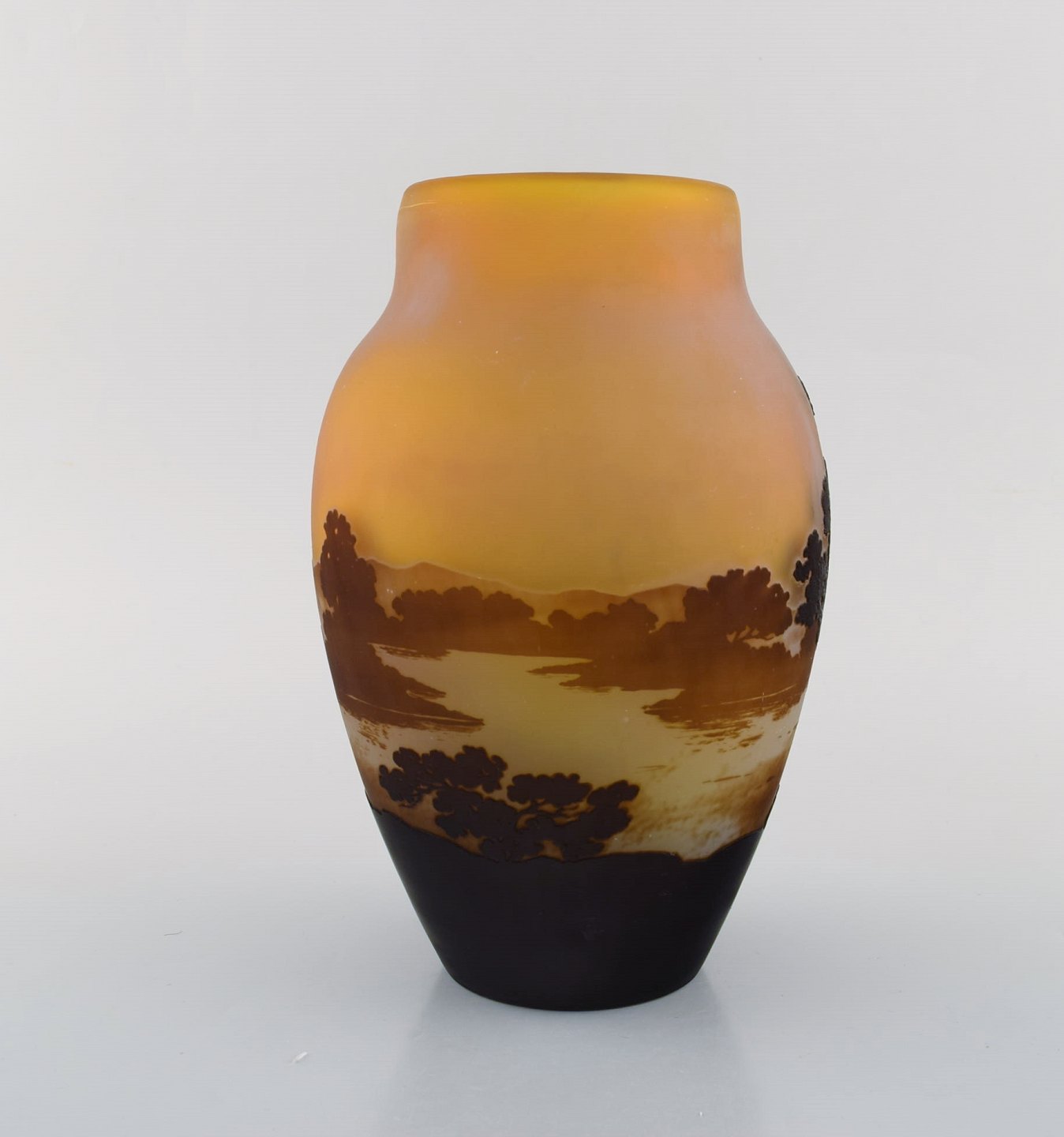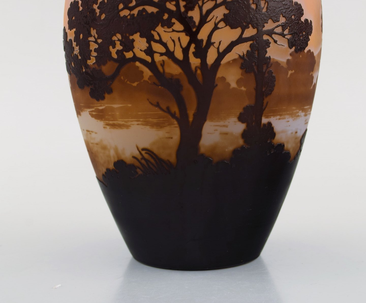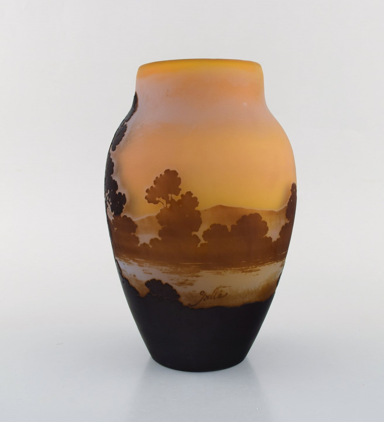 Tidlig Emile Gallé vase i ravfarvet kunstglas med brunt overfang udskåret med motiver af træer og solnedgang. Tidligt 1900-tallet. Måler: 20,5 x 13,5 cm. I flot stand. Signeret.