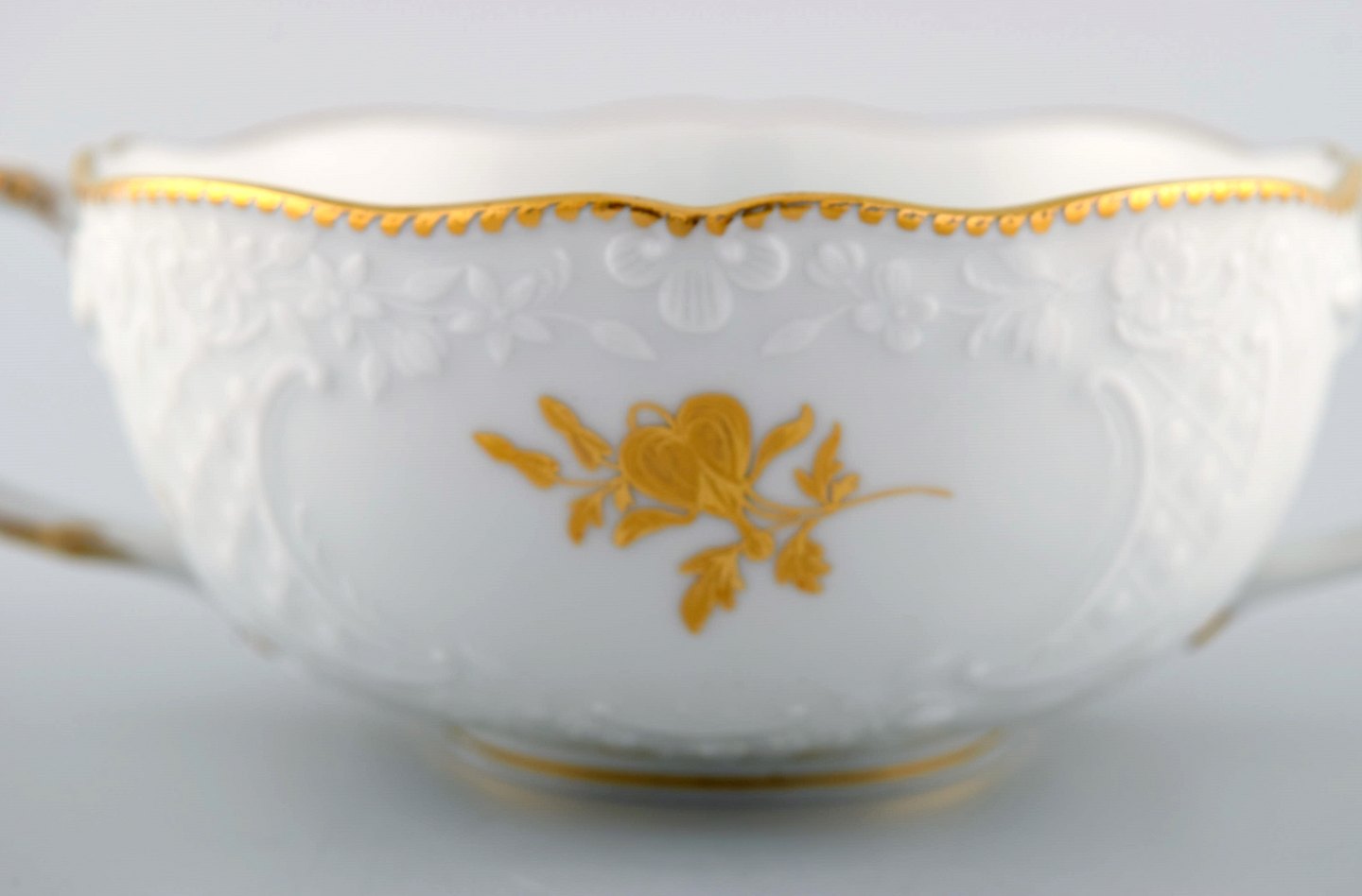 Seks Meissen boullionkopper med underkopper i porcelæn med blomster og bladværk i relief og gulddekoration. 1900-tallet.