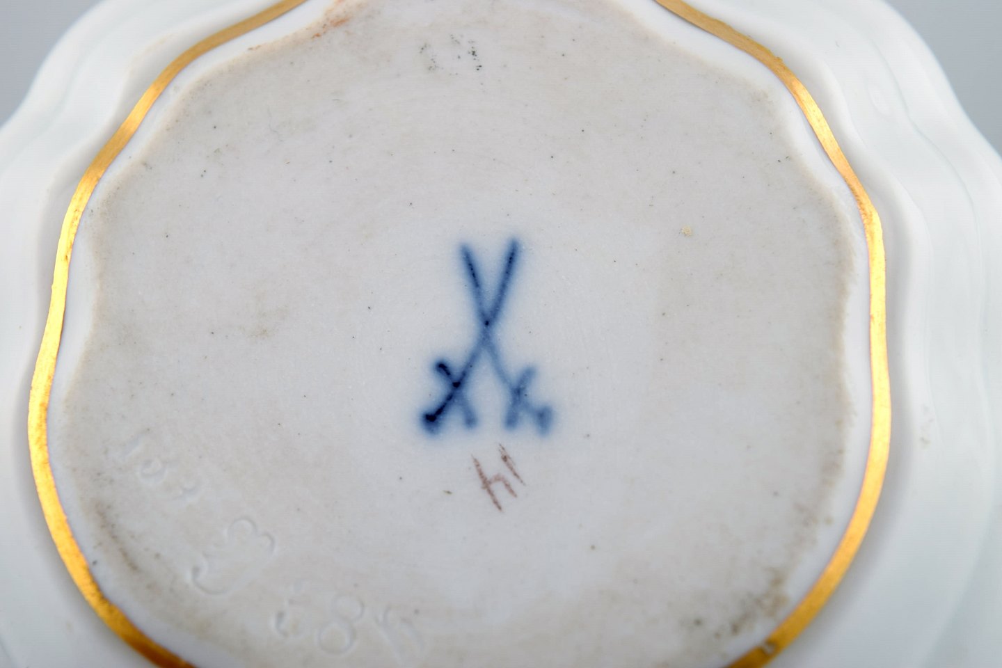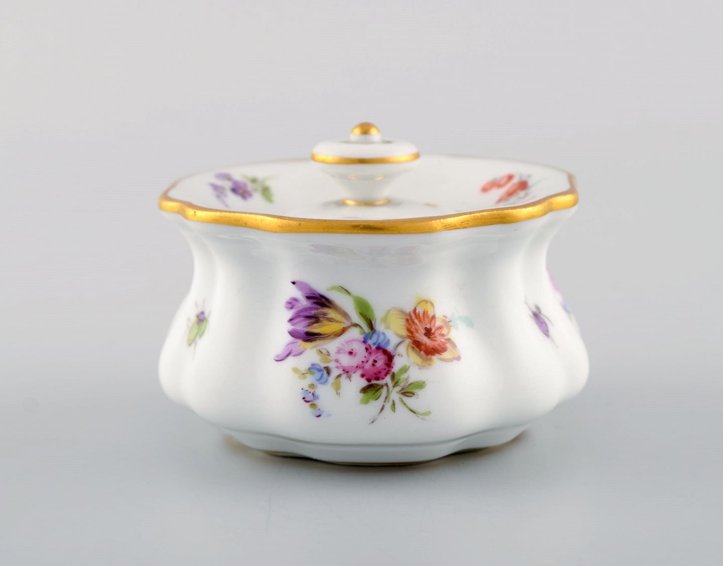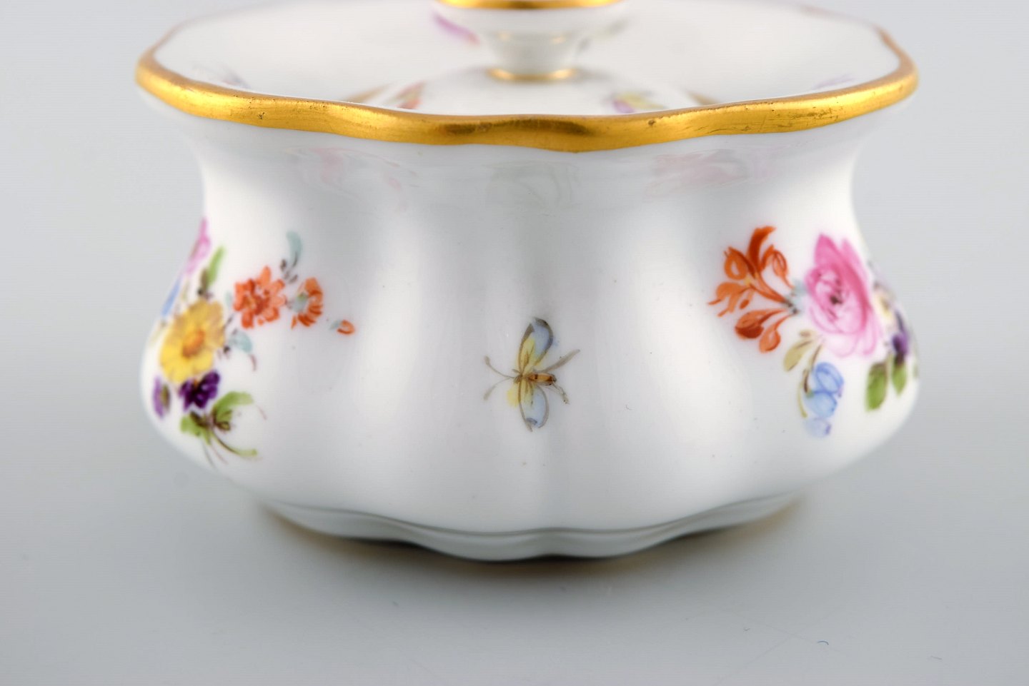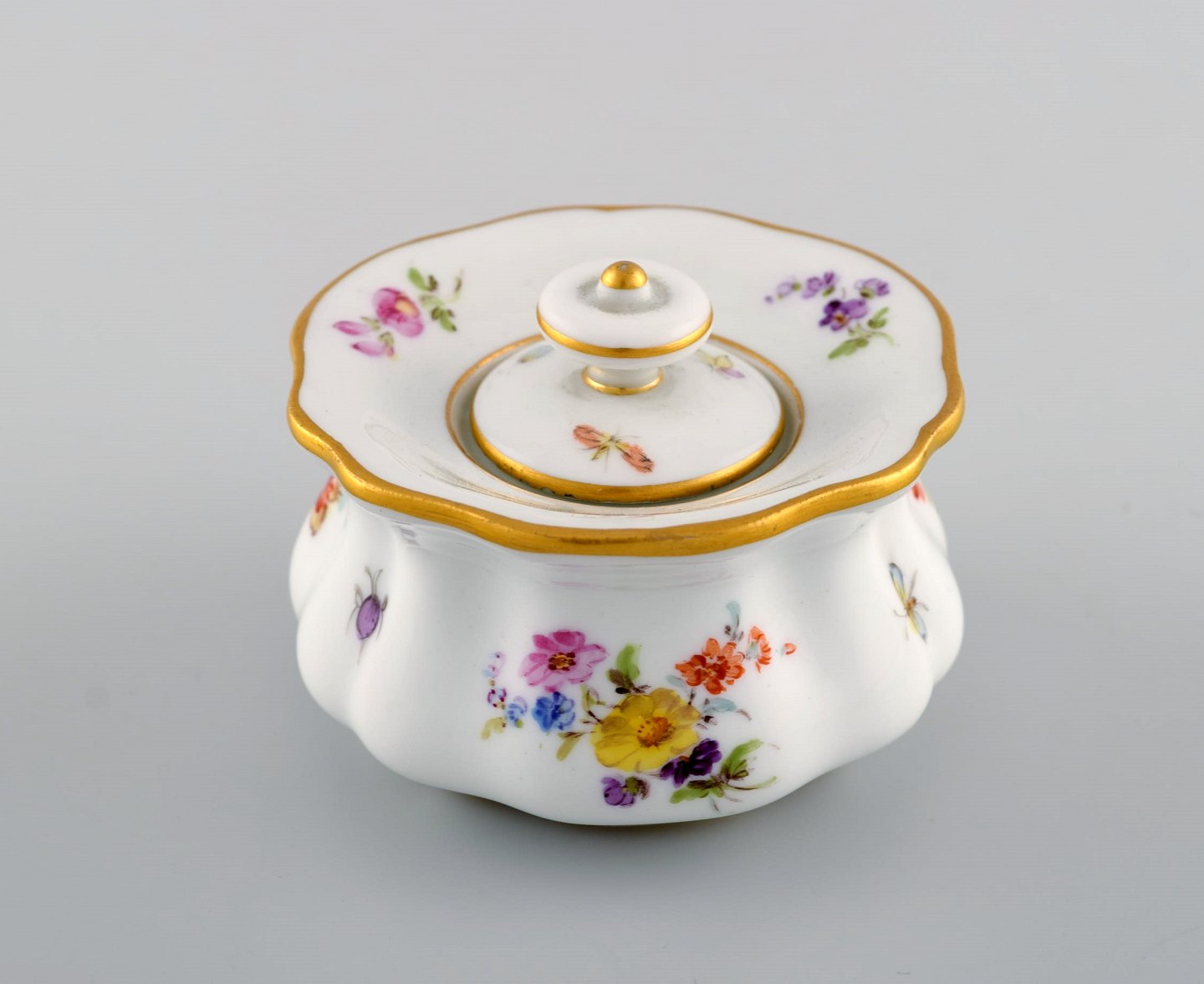 Antikt Meissen blækhus i håndmalet porcelæn med blomstermotiver og guldkant. 1800-tallet.