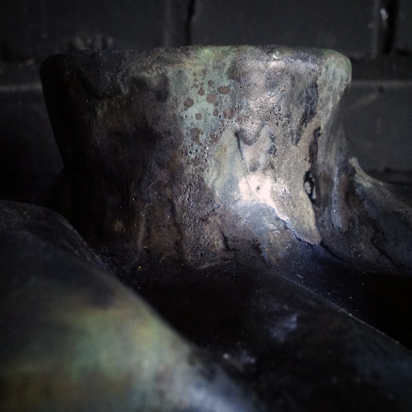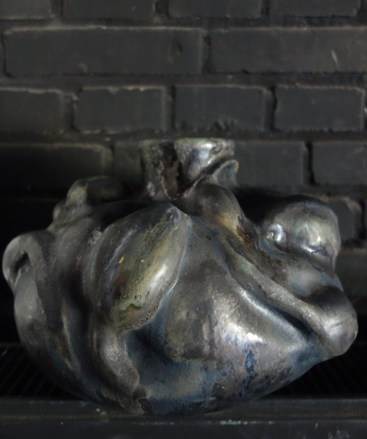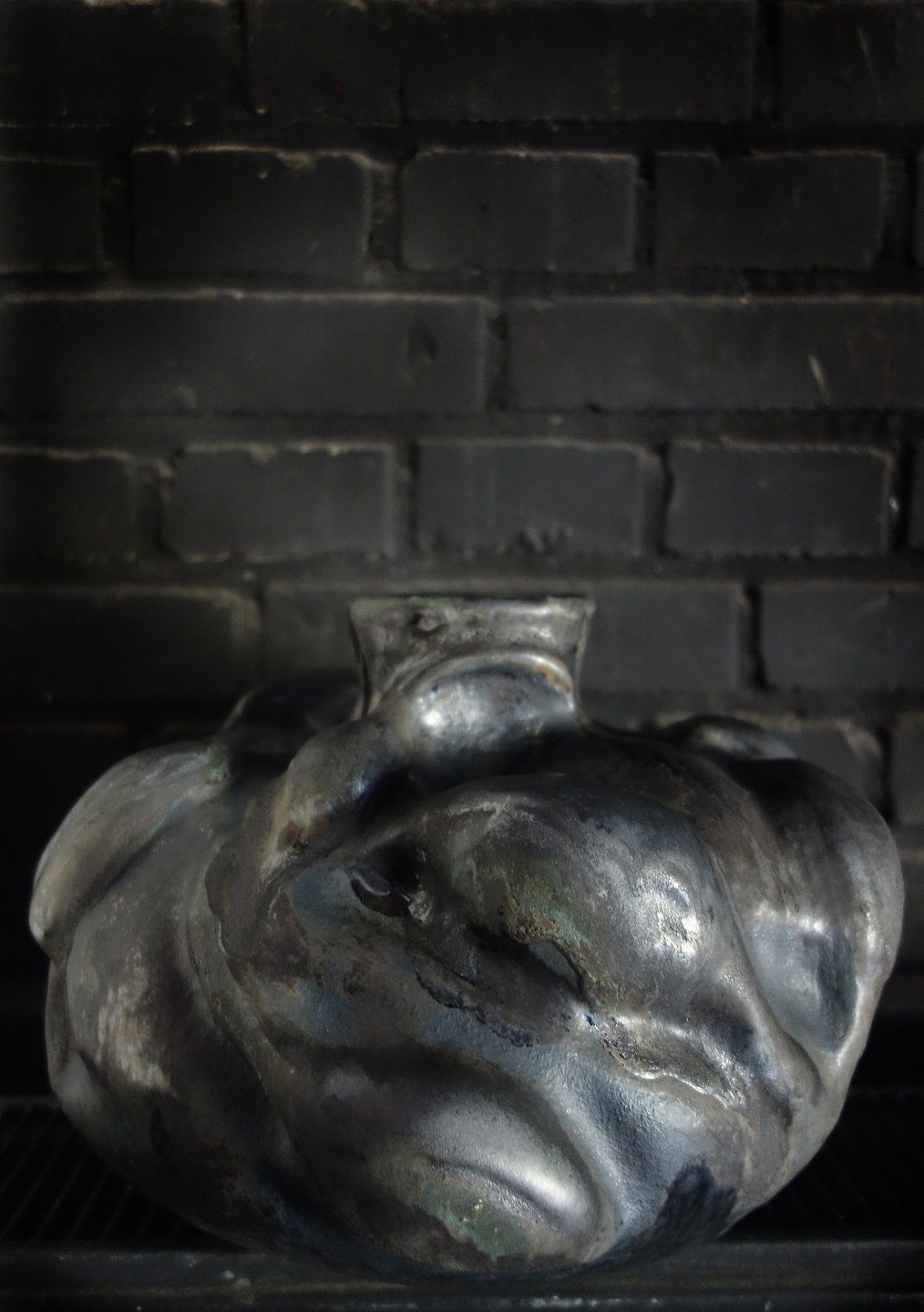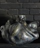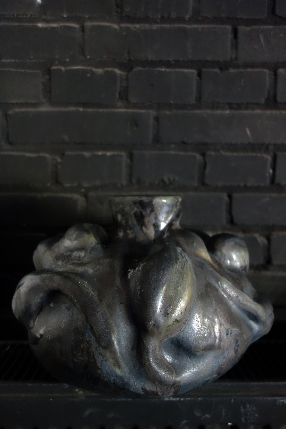 Christina Muff, dansk samtidskeramiker (f. 1971). Stor Skulpturel vase dekoreret med spirende blomster. Denne dramatiske skulptur er glaseret med dyb sort glasur der har sølvtoner på høje punkter og lejlighedsvist dybe gørnne strejf. Krukken er en del af ‘Seed’ kollektionen af Christina Muff. Unika.