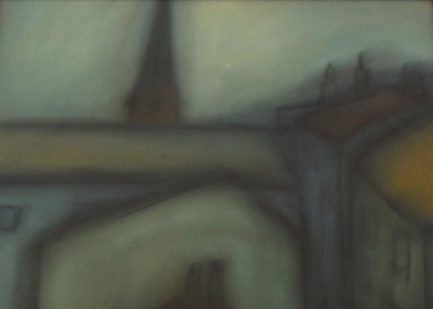 Gillis Sahlin (1901-1984), Sverige. Pastel. Modernistisk bymotiv. Dateret 1954.