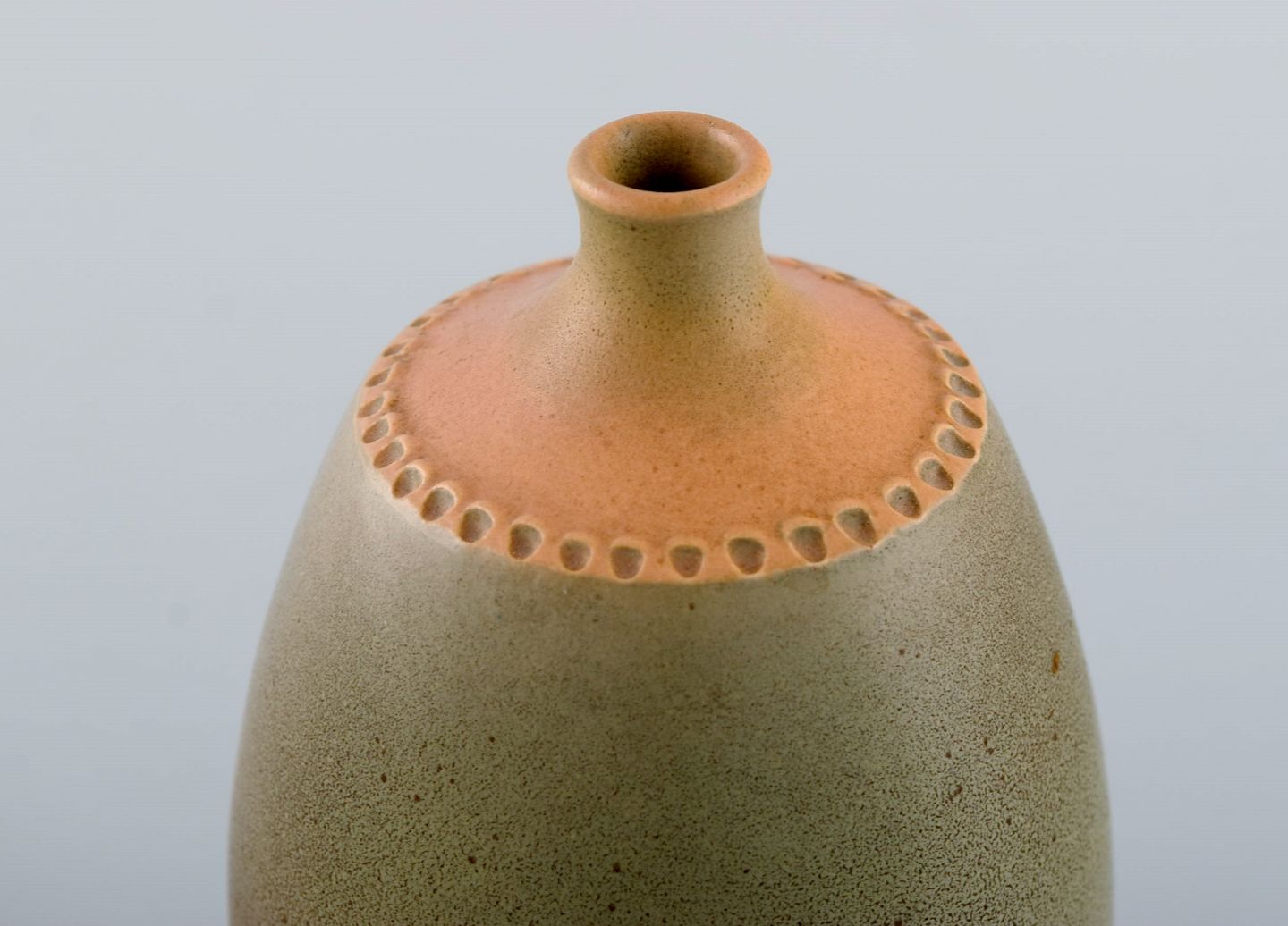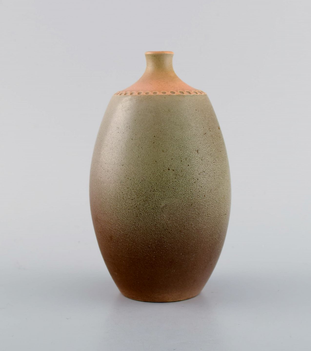 European studio ceramicist. Unique vase in glazed ceramics. 1970s. Measures: 15 x 8.7 cm. In excellent condition. Signed.