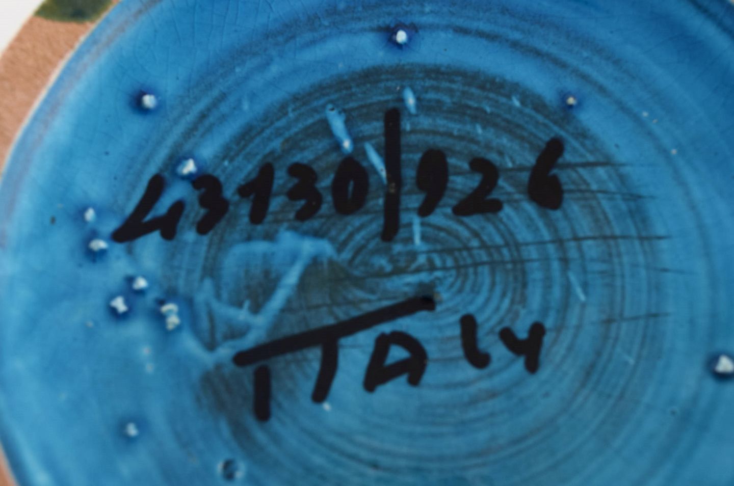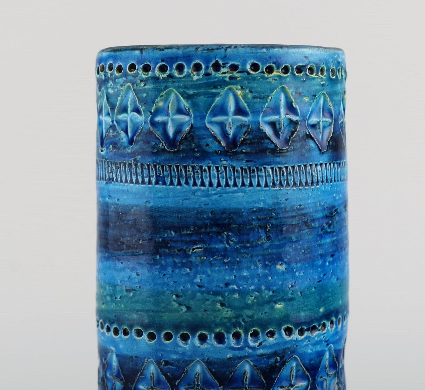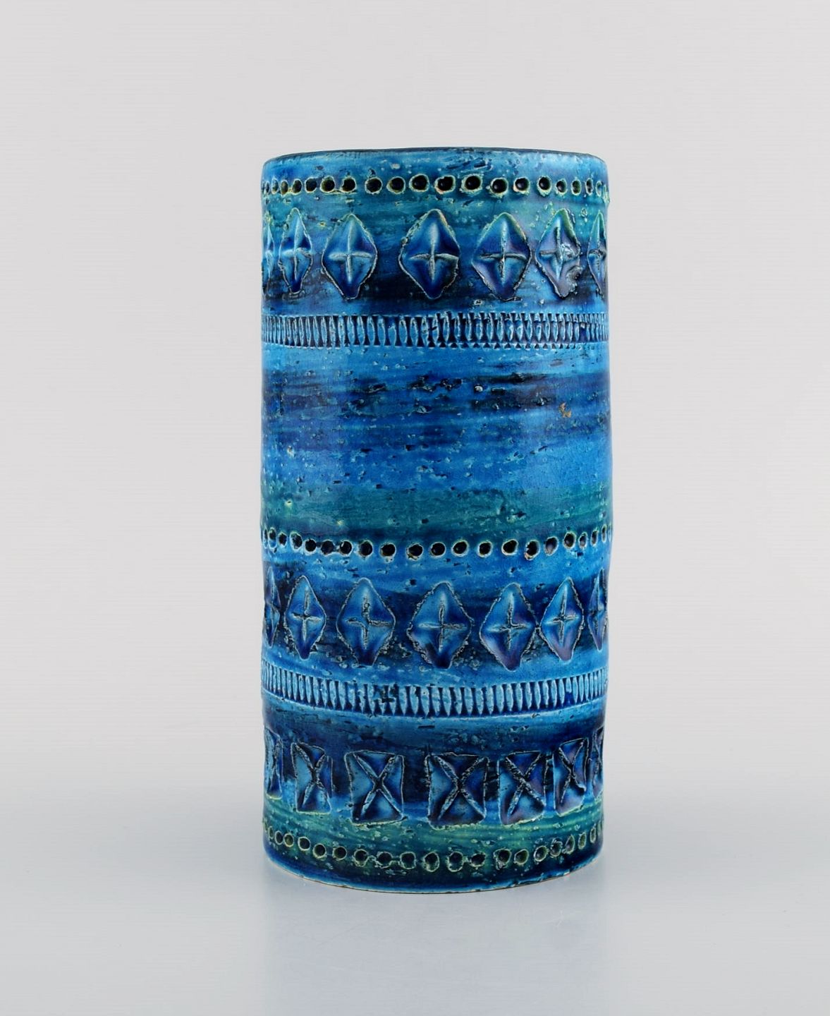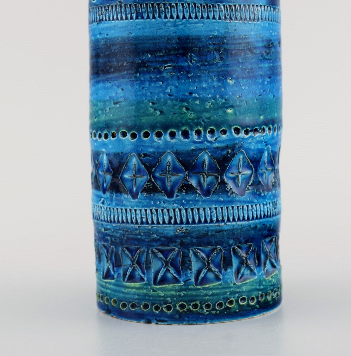 Aldo Londi for Bitossi. Cylindrisk vase i Rimini-blå glaseret keramik med geometriske mønstre. 1960'erne. Måler: 17,5 x 8,7 cm. I flot stand. Stemplet.