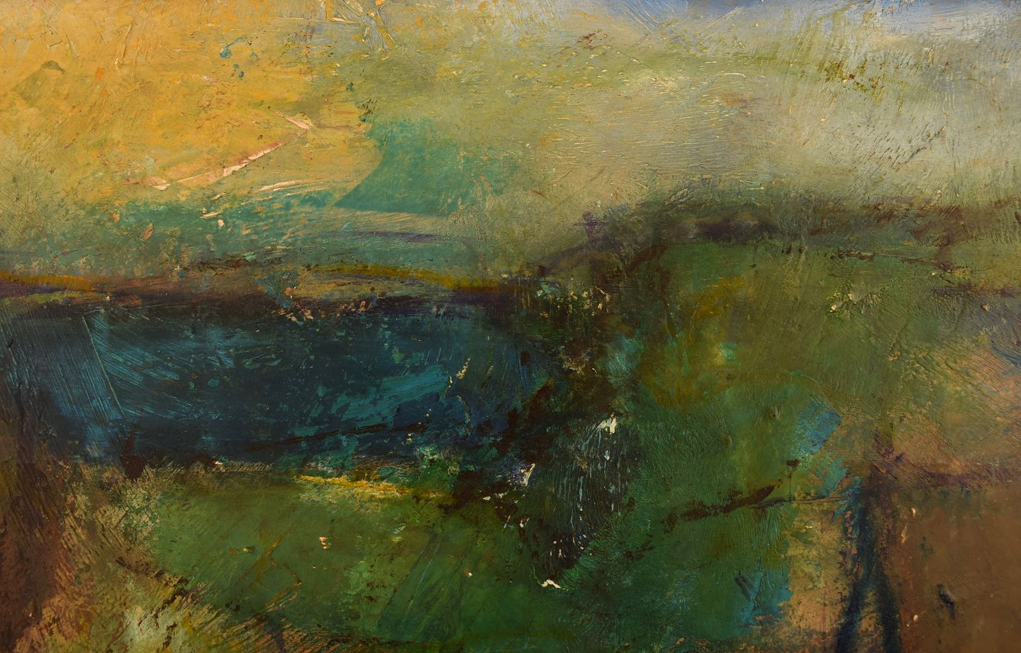 Poul K. Jørgensen, Danmark. Olie på plade. Abstrakt landskab. Dateret 1978.
