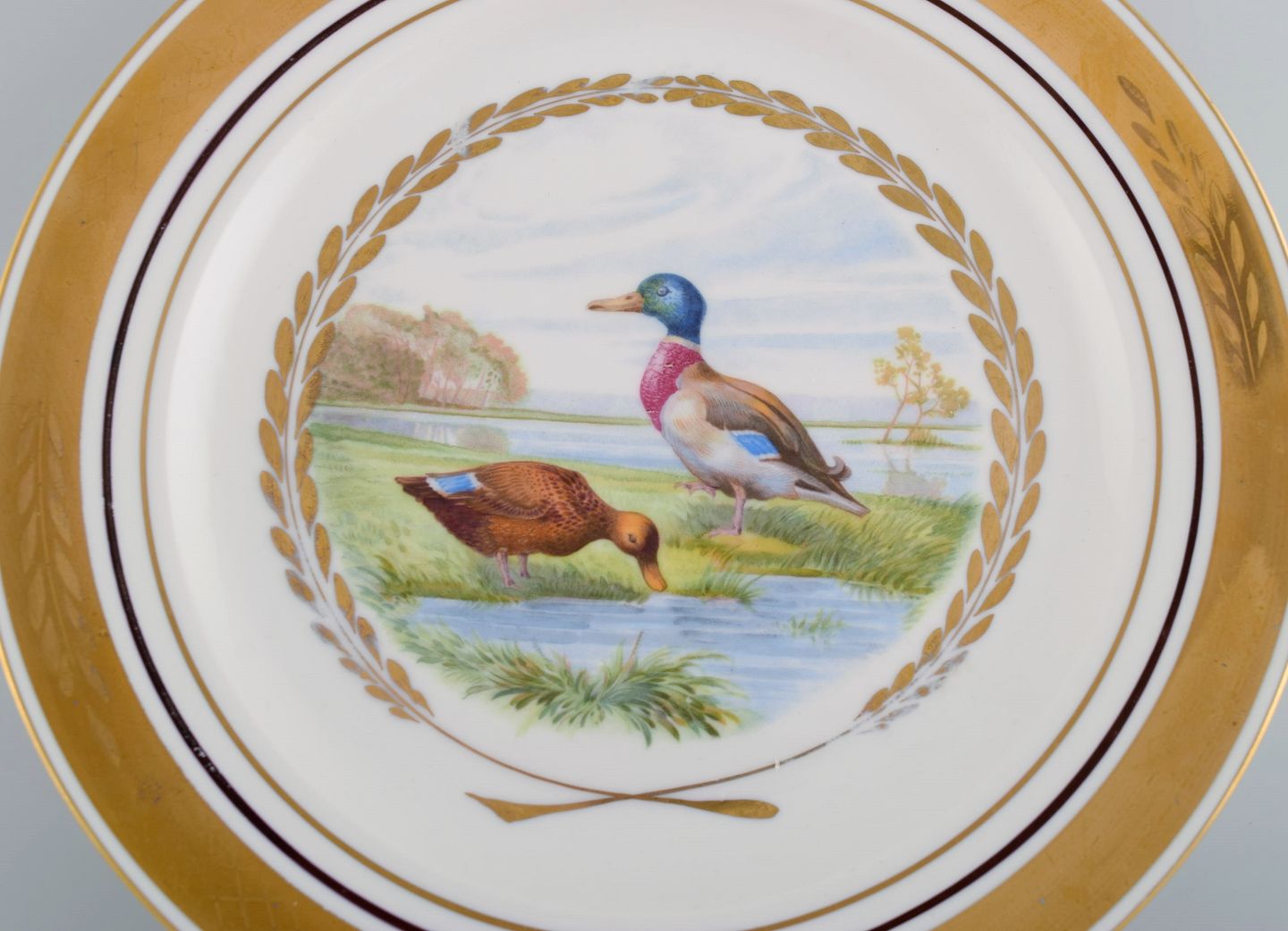 Royal Copenhagen. Sæt på fem store middags- / dekorationstallerkener med håndmalede fuglemotiver. Dateret 1959.