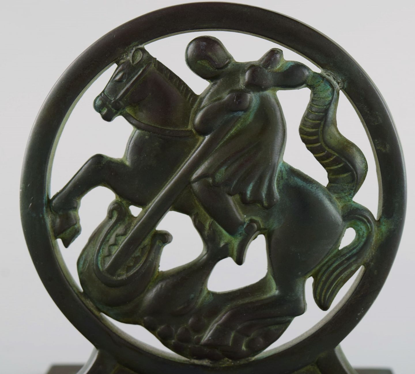 Just Andersen, Danmark. Et par art deco bogstøtter i diskometal med Sankt Georg og dragen. 1940'erne. Modelnummer 1626. Måler: 10 x 9,5 cm. I flot stand. Stemplet.