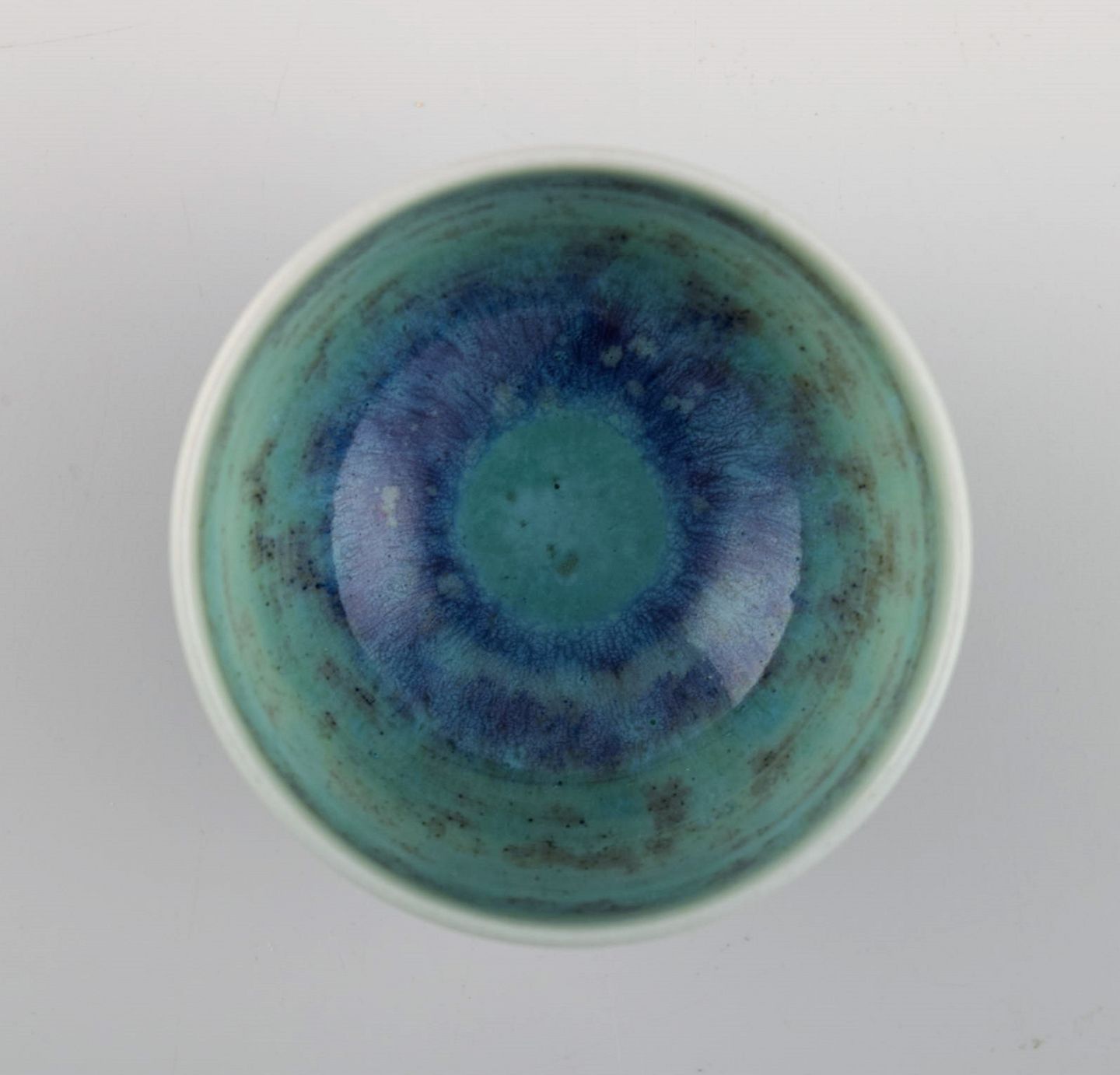 Berndt Friberg (1899-1981) for Gustavsberg Studiohand. Miniature skål i glaseret stentøj. Smuk Aniara glasur. Ca. 1970. Måler: 4,7 x 2,8 cm. I flot stand. Signeret.