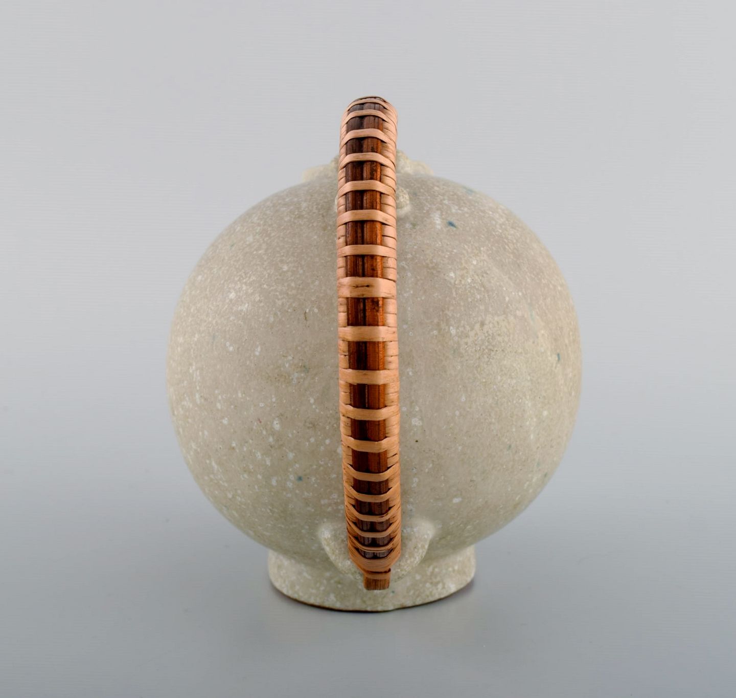 Arne Bang (1901-1983), Danmark. Kande i glaseret keramik med hank i flet. Modelnummer 151. Smuk spættet glasur i sandnuancer. 1940/50'erne. Måler: 18,5 x 15,5 cm (ink hank). I flot stand. Signeret.