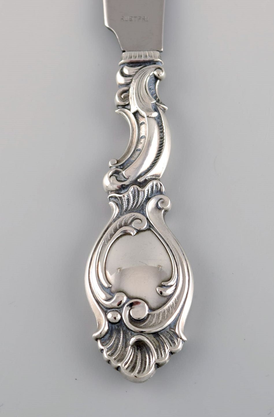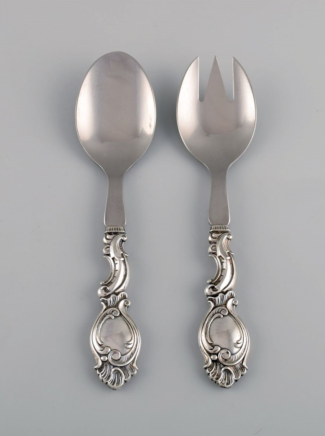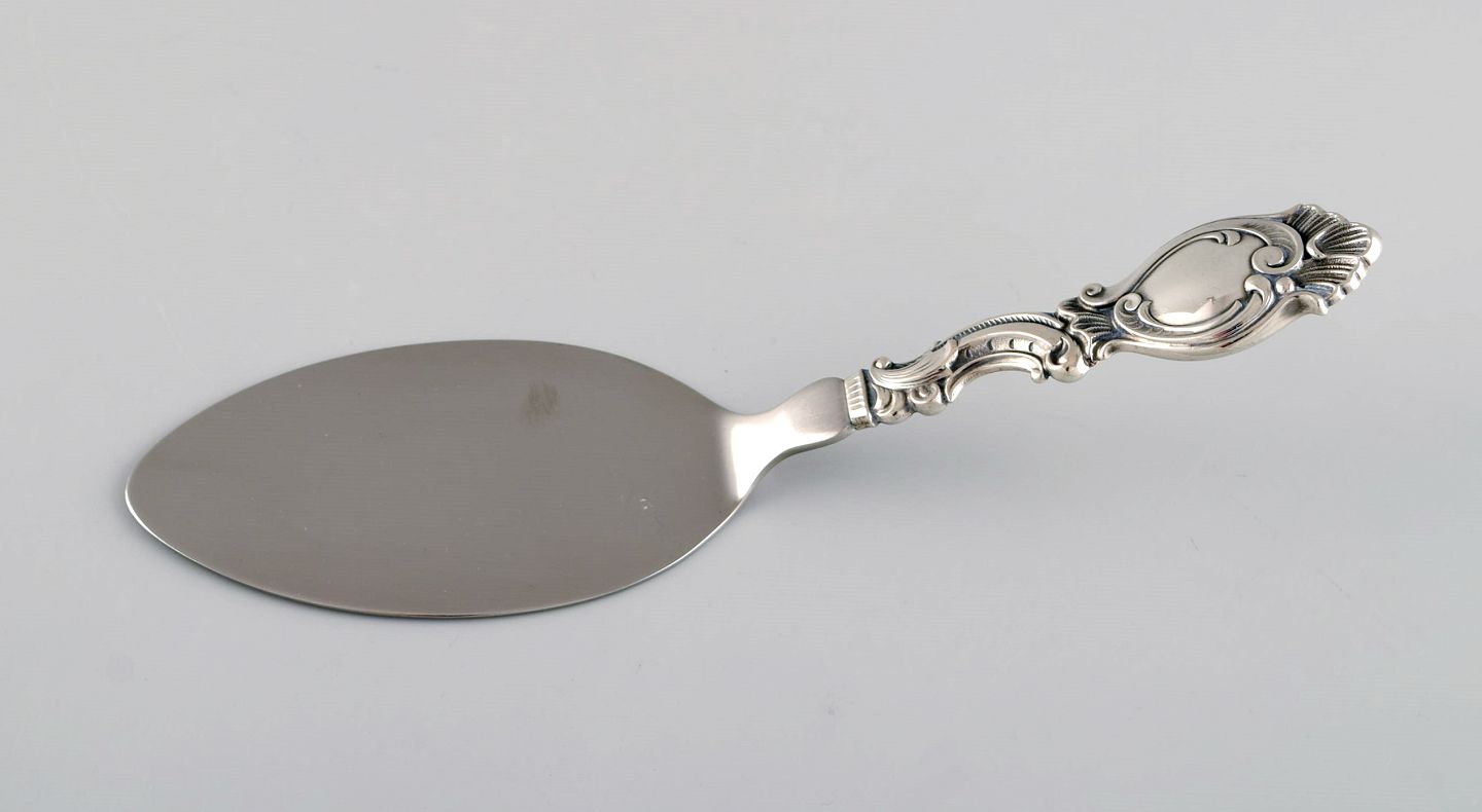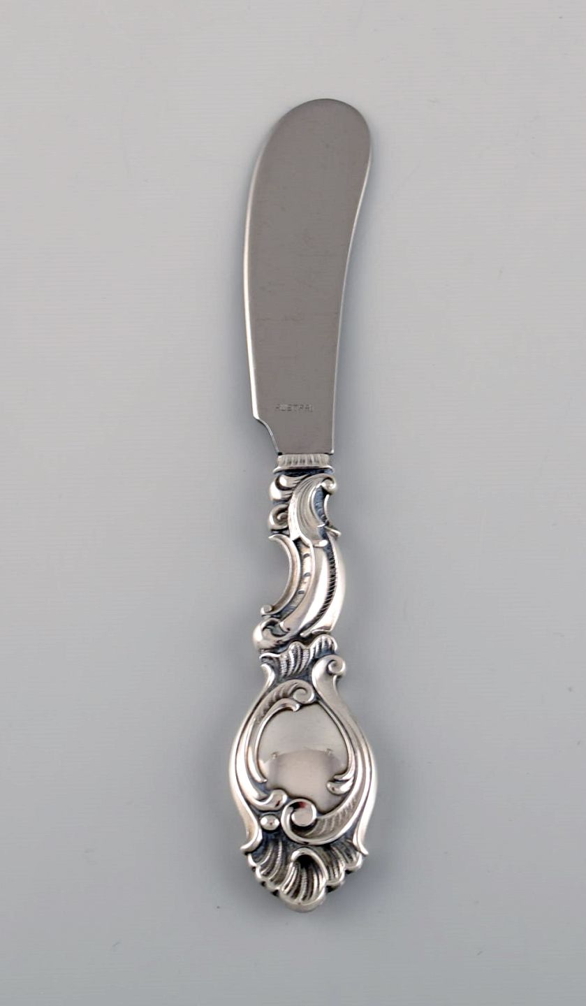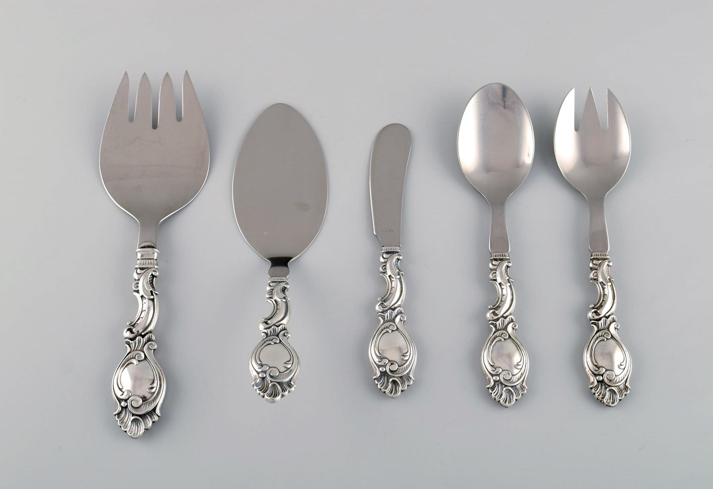 Dansk sølvsmed. Fem serveringsdele i tretårnet sølv. Rokoko stil, 1940'erne. Største måler: 20 cm. Smørkniv længde: 15,3 cm. I flot stand. Stemplet.