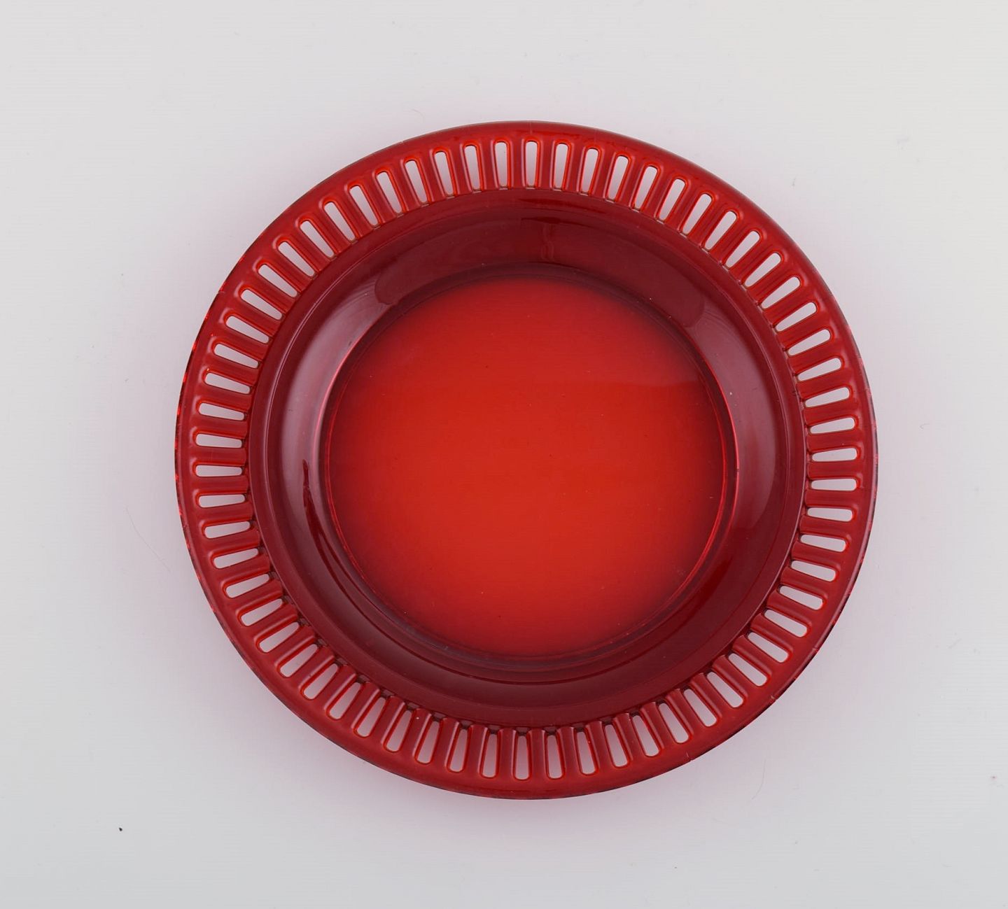 Monica Bratt for Reijmyre. Seks tallerkener i rødt mundblæst kunstglas. 1950/60'erne. Diameter: 18 cm. I flot stand.
