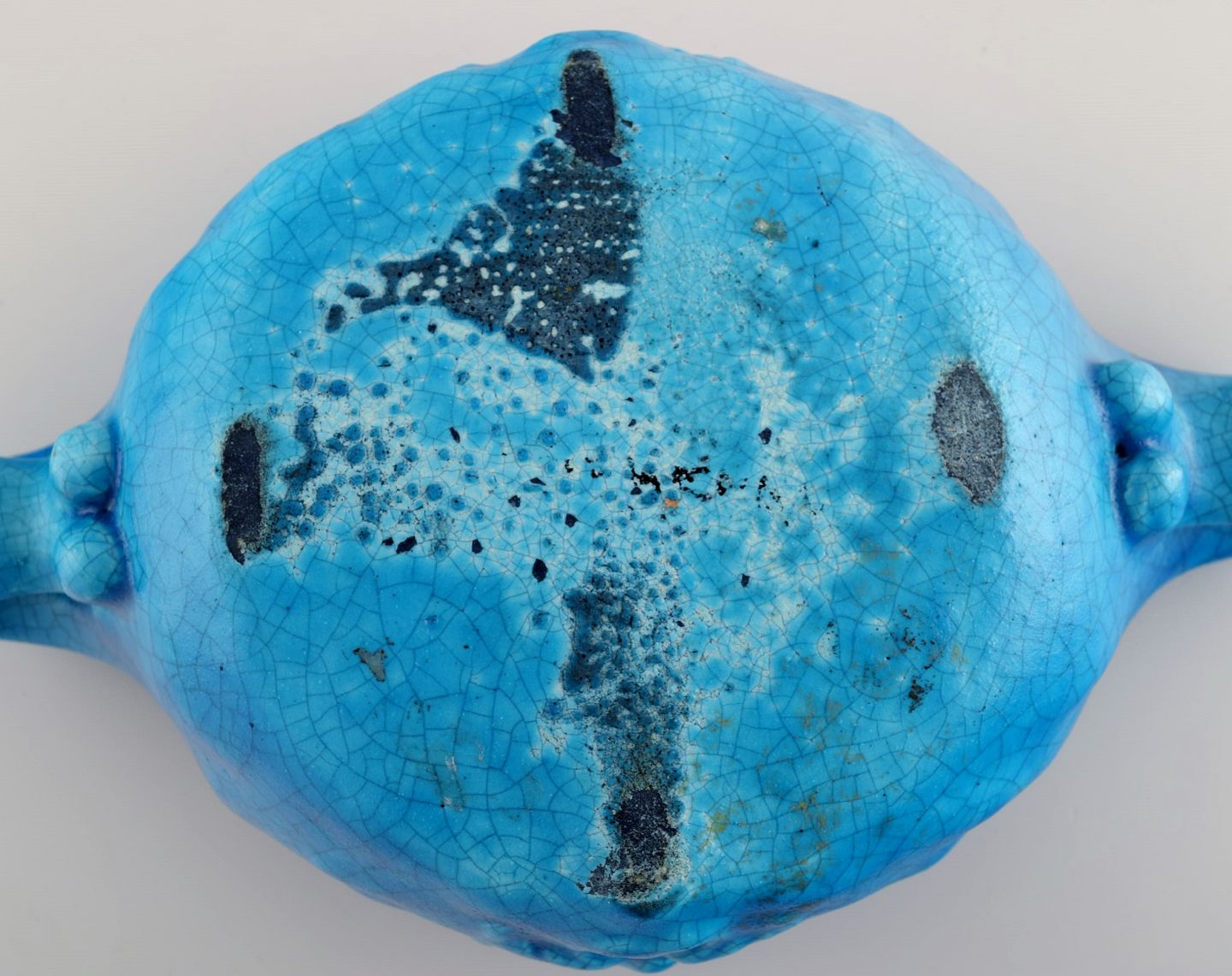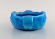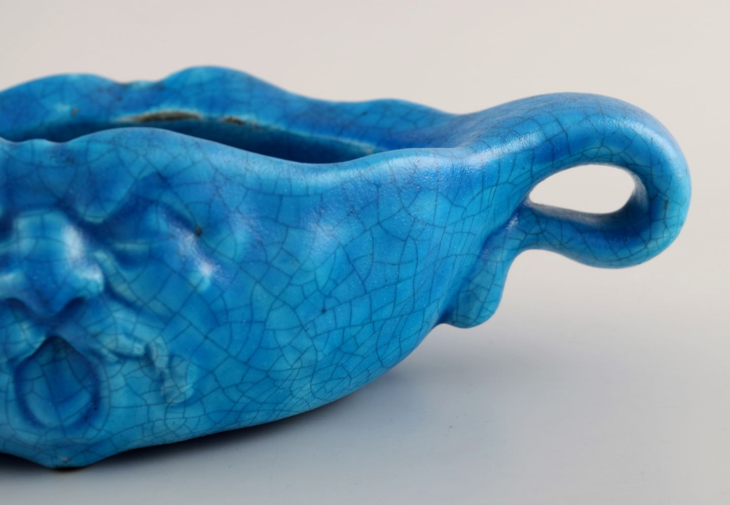 Edmond Lachenal (1855-1948), France. Unique art nouveau bowl with handles in glazed ceramics with a motif of grotesque. Beautiful turquoise glaze. Dated 1910-1920.