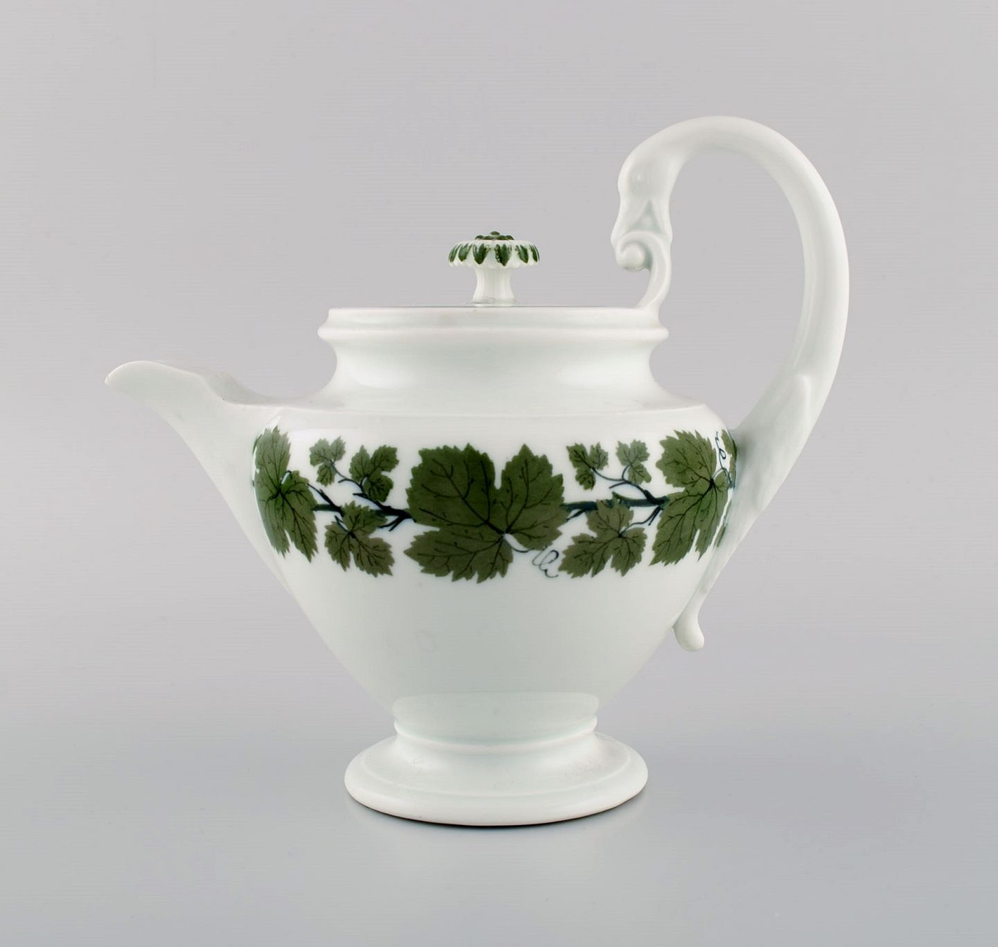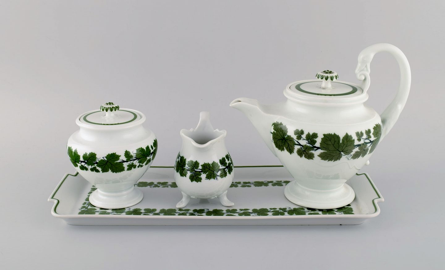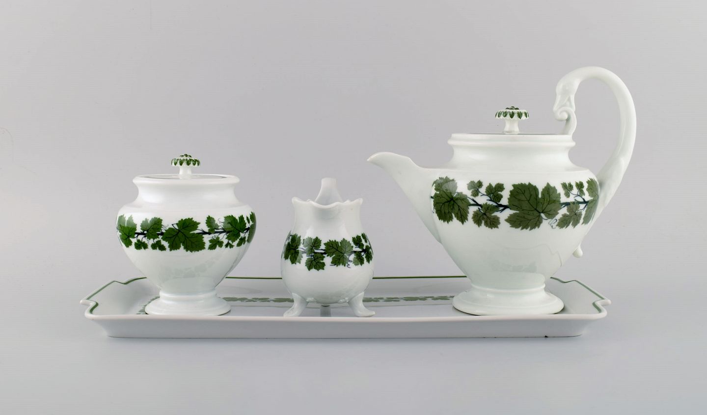 Meissen Green Ivy Vine Leaf. Teapot, sugar bowl, cream jug and serving tray in hand-painted porcelain. 1940s.