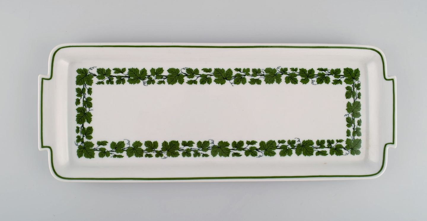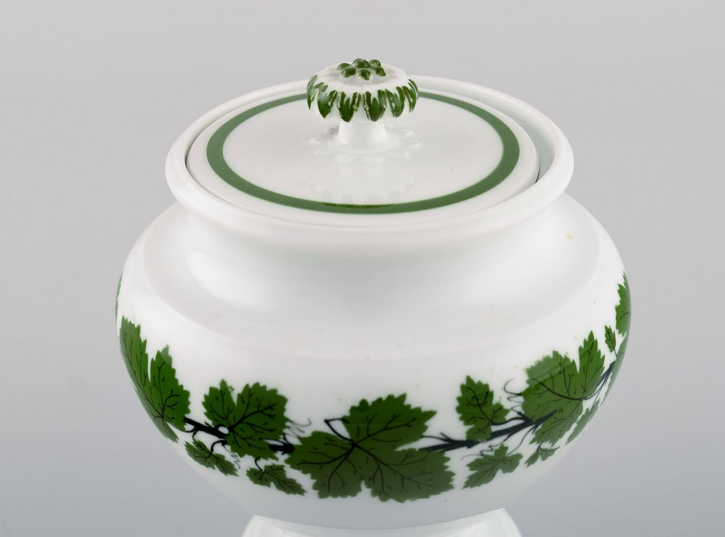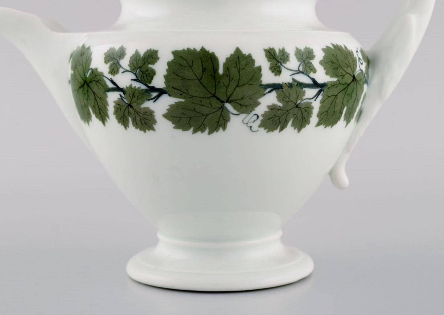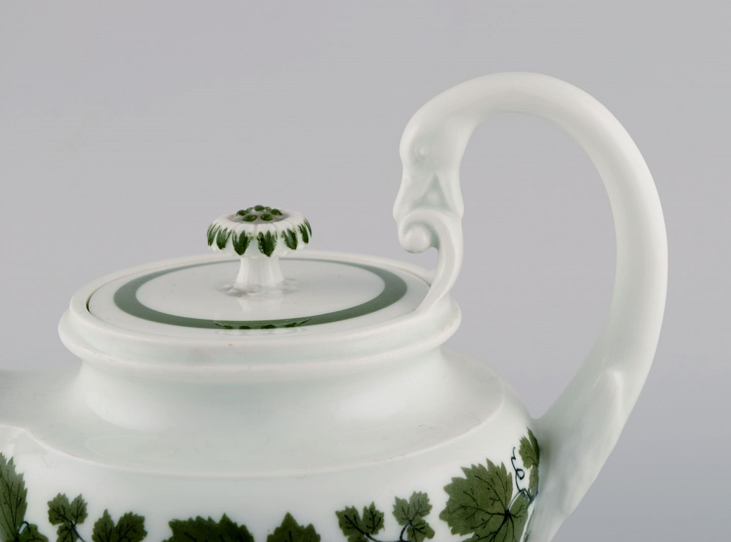Meissen Green Ivy Vine Leaf. Teapot, sugar bowl, cream jug and serving tray in hand-painted porcelain. 1940s.