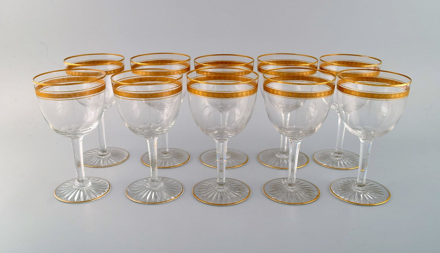 Baccarat, Frankrig. Ti art deco rødvinsglas i mundblæst krystalglas med gulddekoration i form af blade. 1930'erne. Måler: 16 x 8,5 cm. I flot stand.