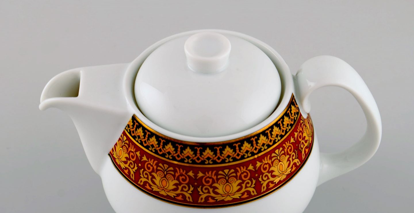 Gianni Versace for Rosenthal. Medusa porcelain teapot with gold decoration. Late 20th century. Measures: 16 x 11 cm. In perfect condition. Stamped. Original box and certificate included.