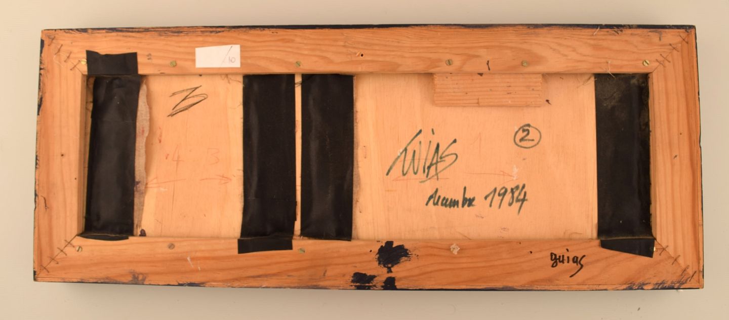 Gilles Guias (f. 1965), fransk kunstner. Akryl på plade. Konkret komposition. Dateret 1984. Pladen måler: 59 x 21 cm. Rammen måler: 2 cm. I flot stand. Signeret.