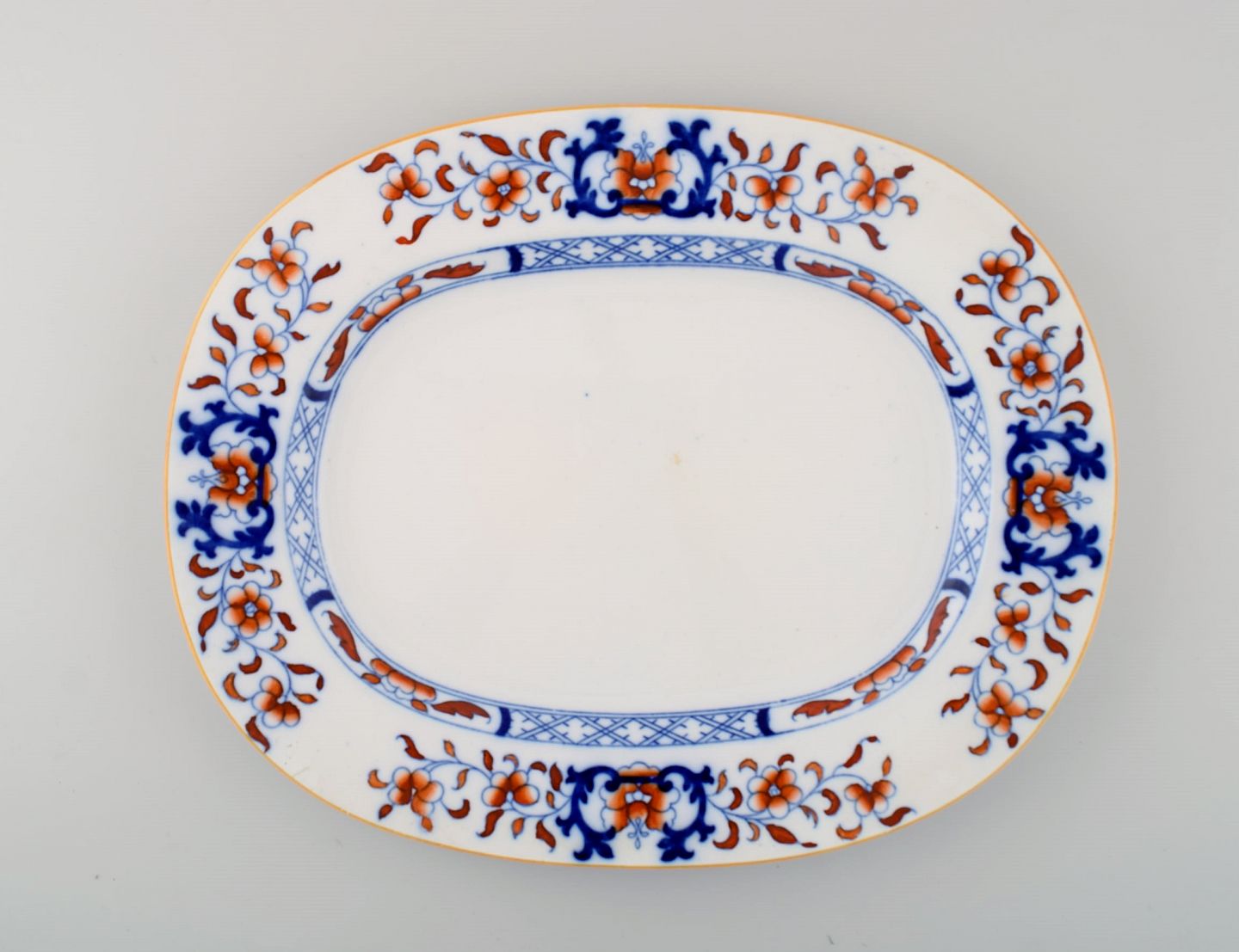 Mintons, England. Tre antikke fade i håndmalet fajance. Kinesisk stil, tidligt 1900-tallet. Største måler: 42 x 34 cm. I flot stand med brugspræg. Stemplet.
